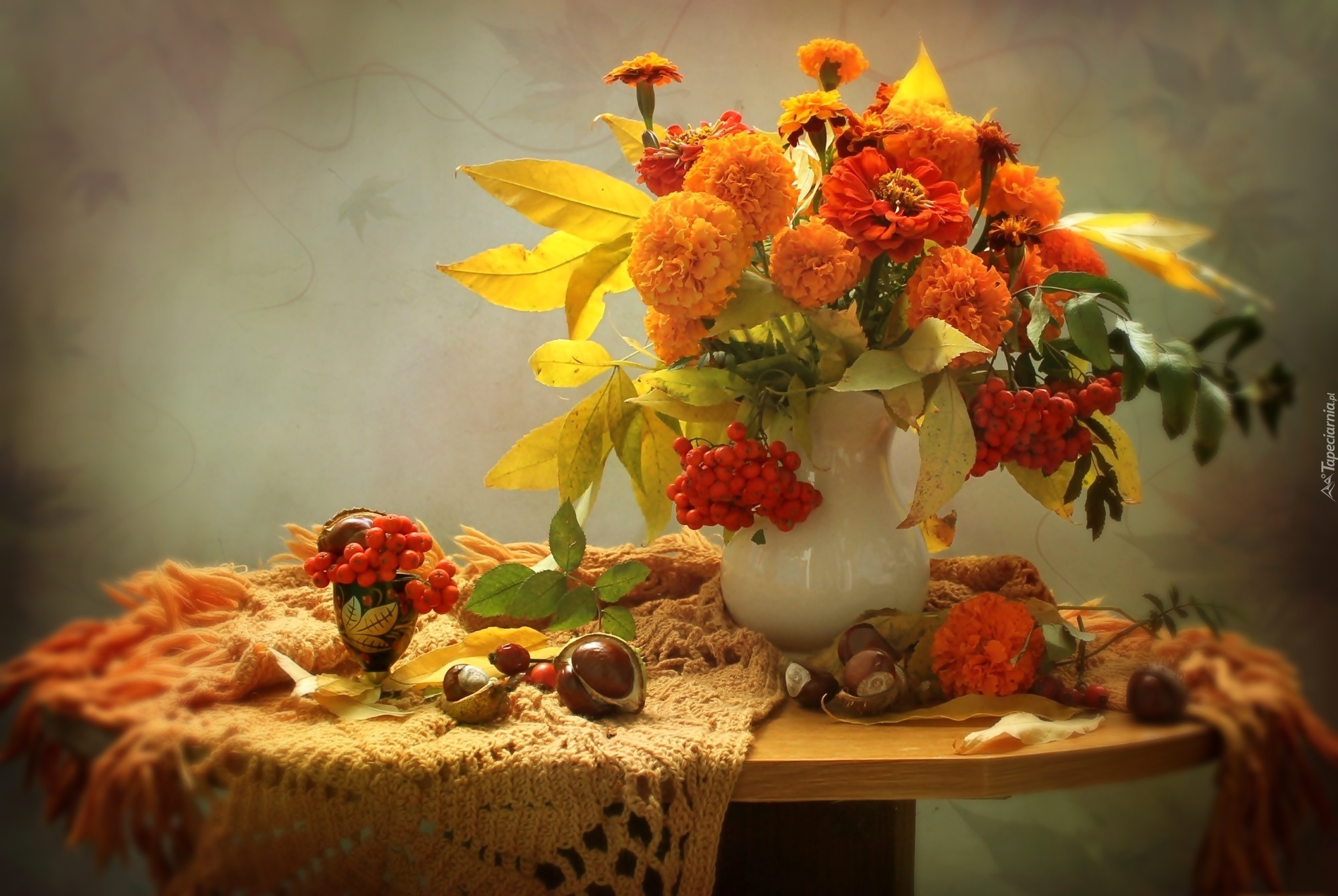 Edytor tapety: Kwiaty, Aksamitki, Wazon, Jarzębina, Liście, Kasztany, Kompozycja