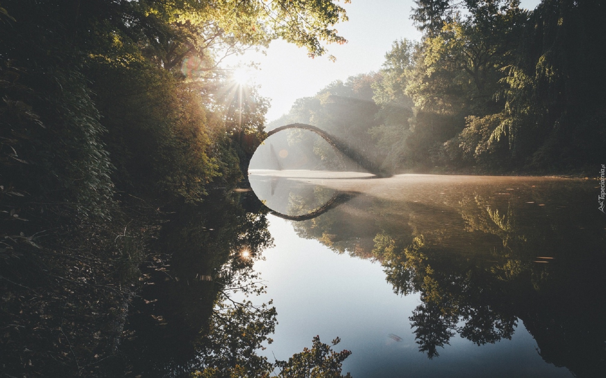 Edytor tapety: Promienie, Słońca, Rzeka, Most, Drzewa, Odbicie