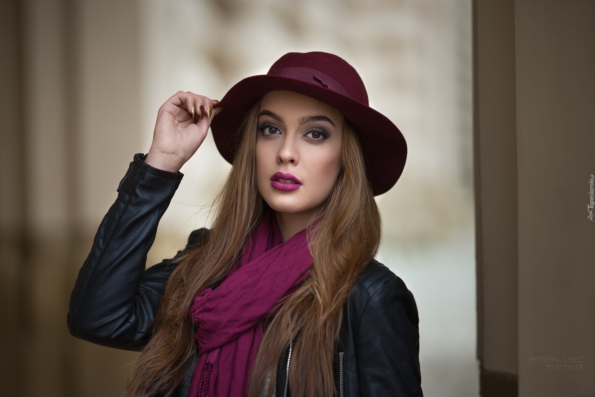 Edytor tapety: Kobieta, Makijaż, Fioletowy, Szal, Kapelusz