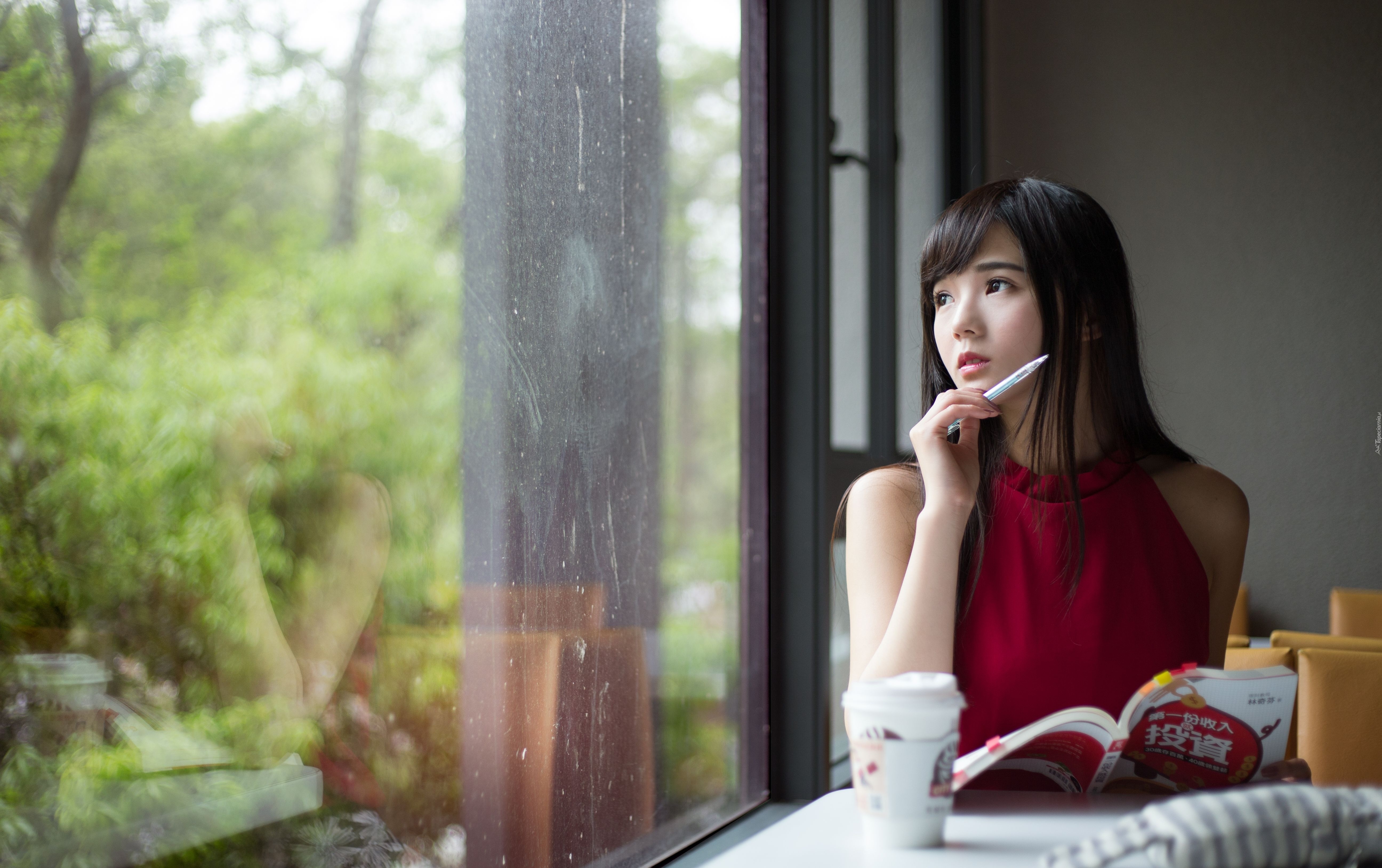 Edytor tapety: Brunetka, Dziewczyna, Długopis, Książka, Kubek, Okno, Odbicie