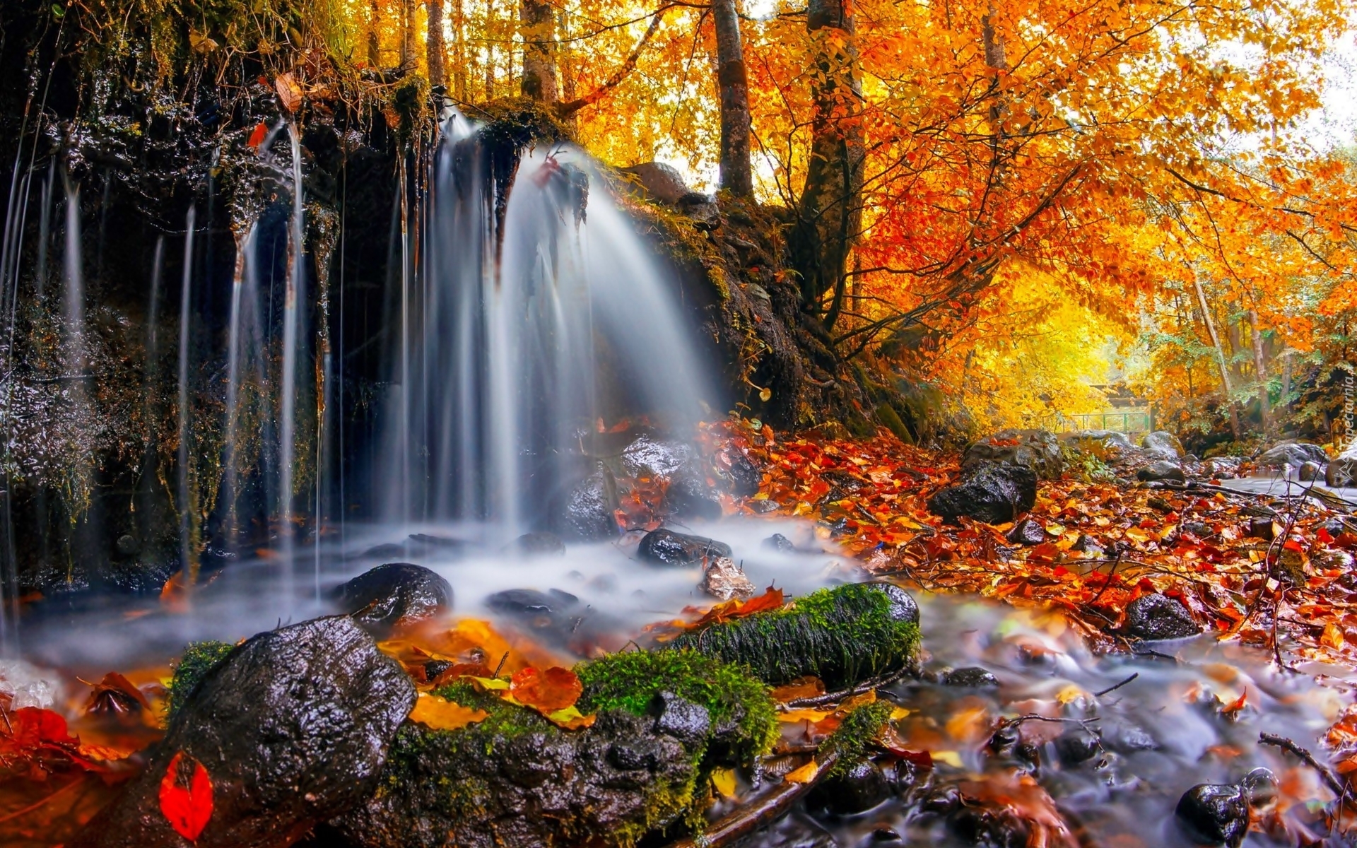 Edytor tapety: Wodospad, Kamienie, Liście, Rzeka, Most, Las, Jesień