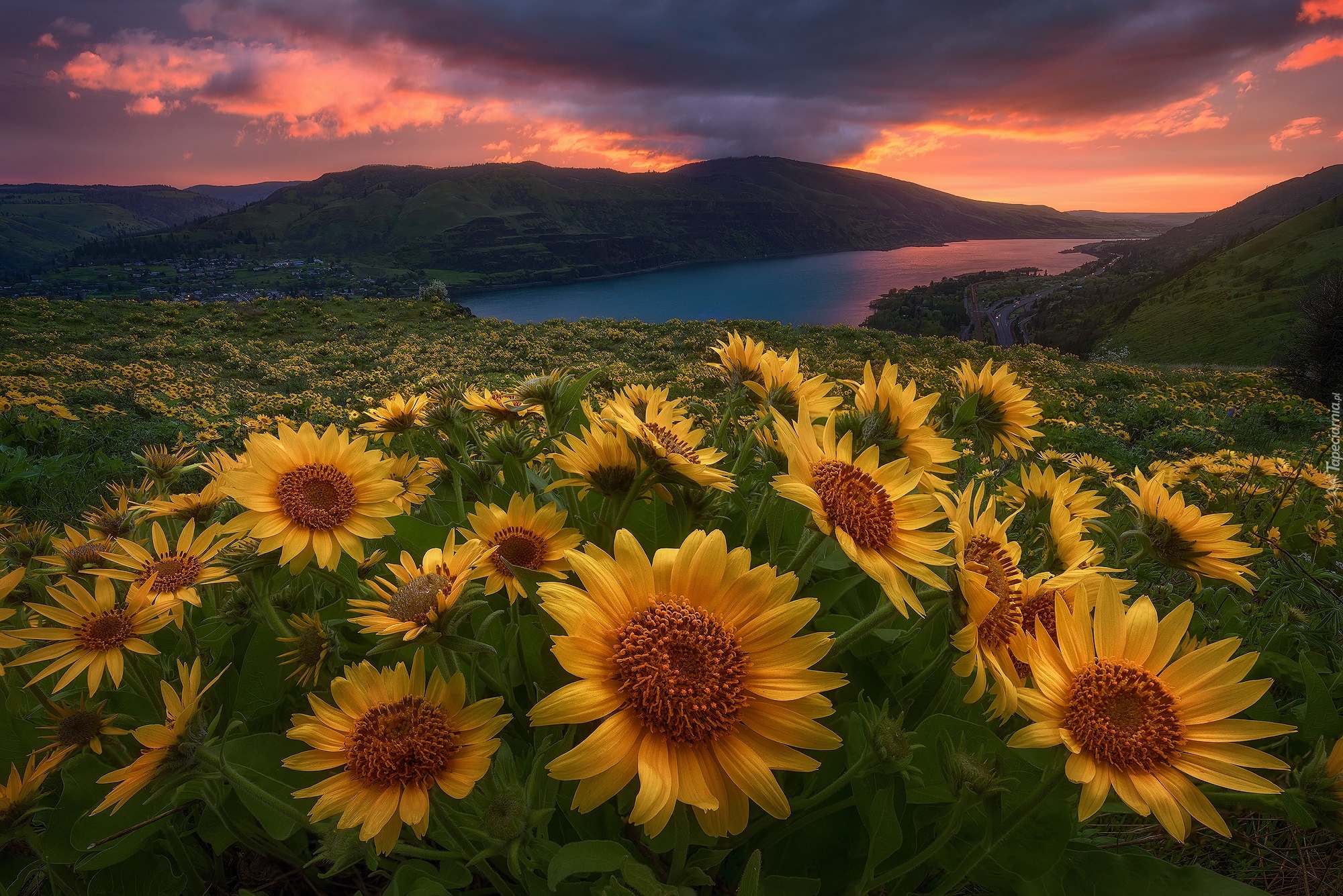 Edytor tapety: Kwiaty, Balsamorhiza, Jezioro, Góry, Zachód, Słońca