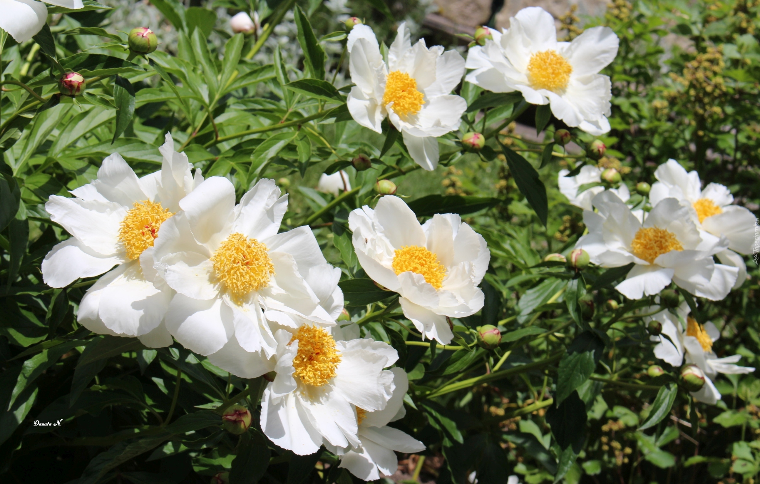 Edytor tapety: Kwiaty, Piwonie, Białe, Pąki, Liście, Ogród