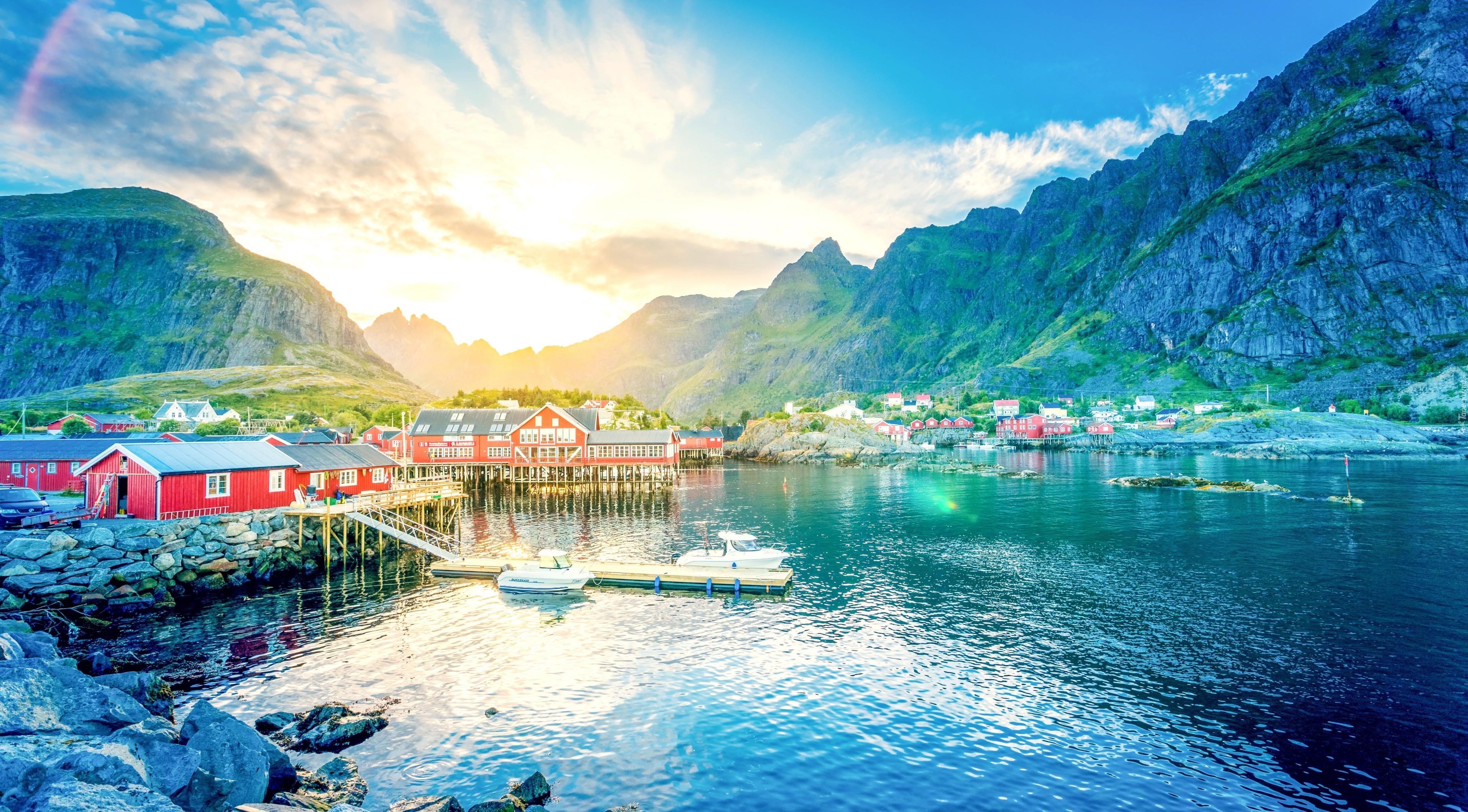 Edytor tapety: Góry, Jezioro, Wschód słońca, Budynki, Łodzie, Norwegia
