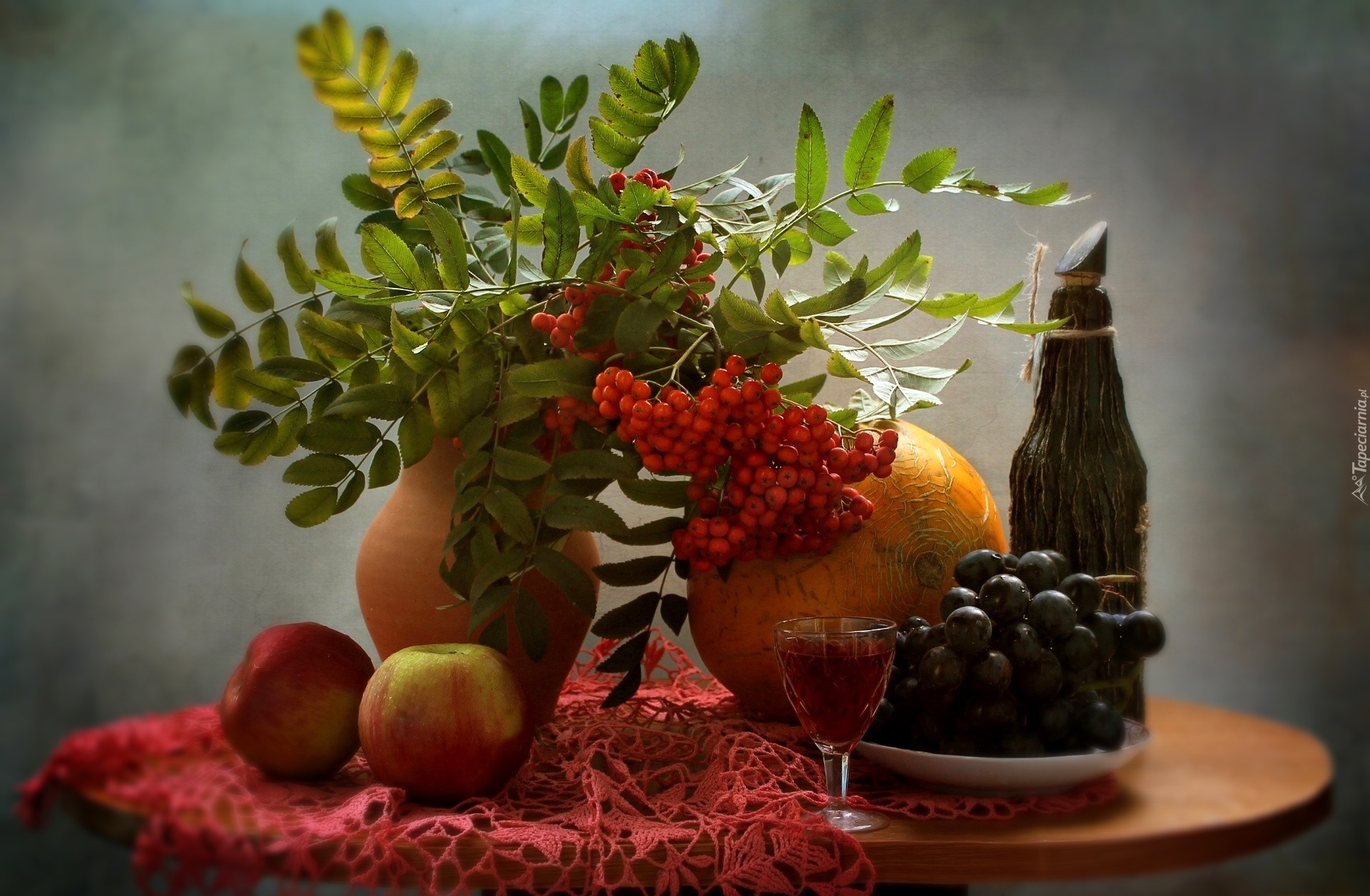 Edytor tapety: Kompozycja, Wazon, Jarzębina, Jabłka, Winogrona, Melon, Butelka, Wino