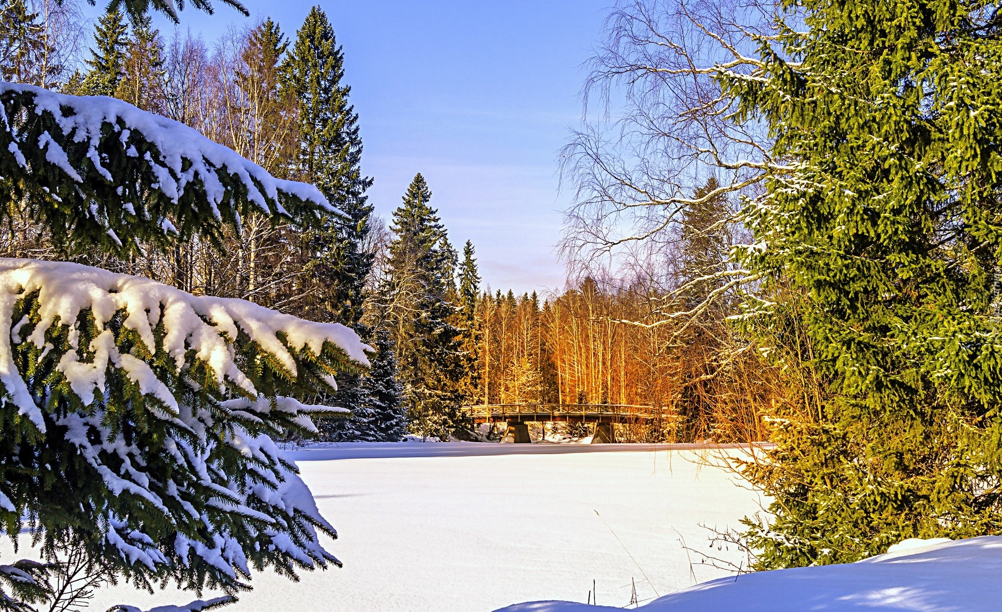 Edytor tapety: Zima, Las, Rzeka, Most