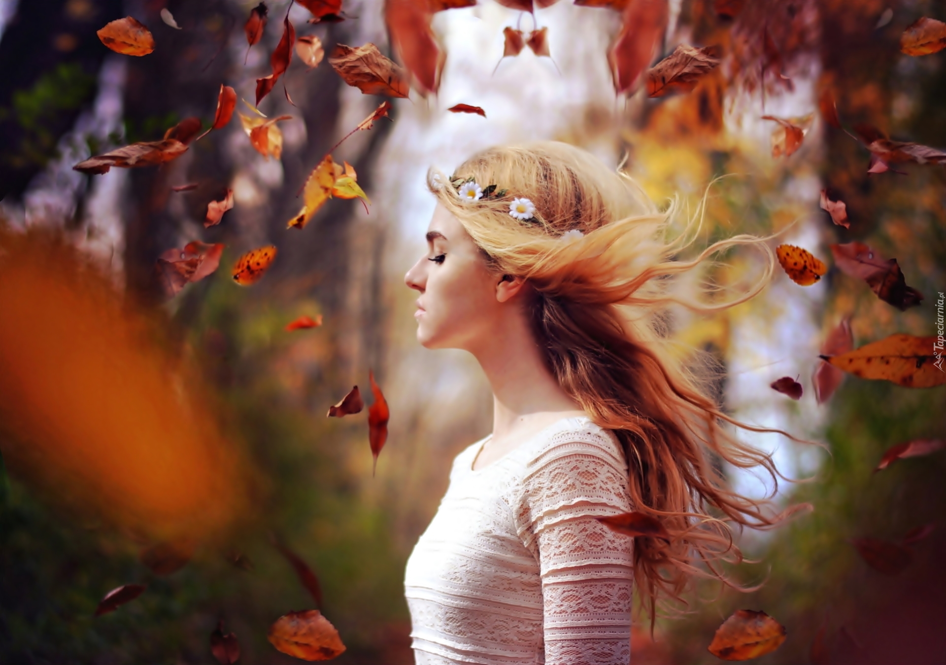 Edytor tapety: Kobieta, Wianek, Rozwiane, Włosy, Liście, Las, Jesień