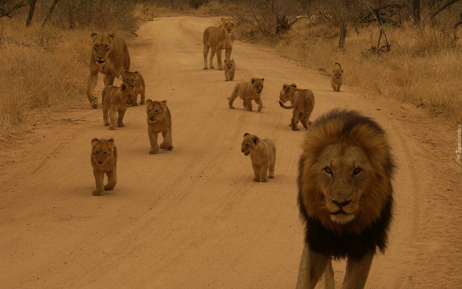 Edytor tapety: Rodzina, Lwice, Lew, Lwiątka, Droga
