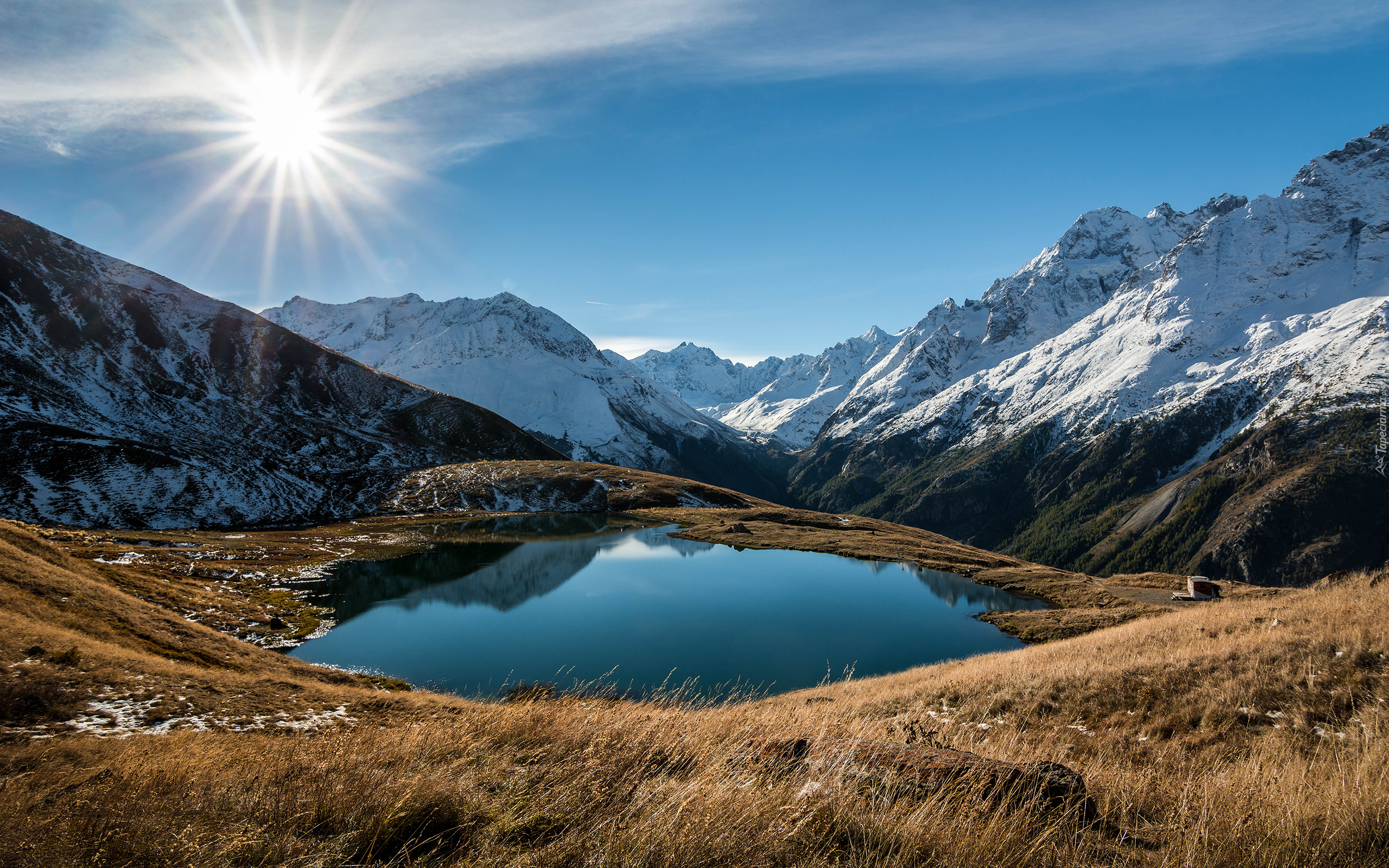 Edytor tapety: Słońce, Góry, Śnieg, Dolina, Staw