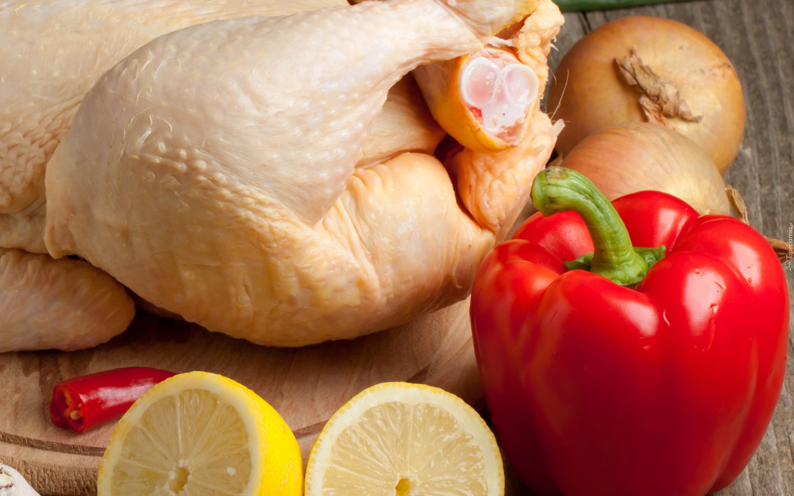Edytor tapety: Mięso, Kurczak, Papryka, Cytryny, Cebula