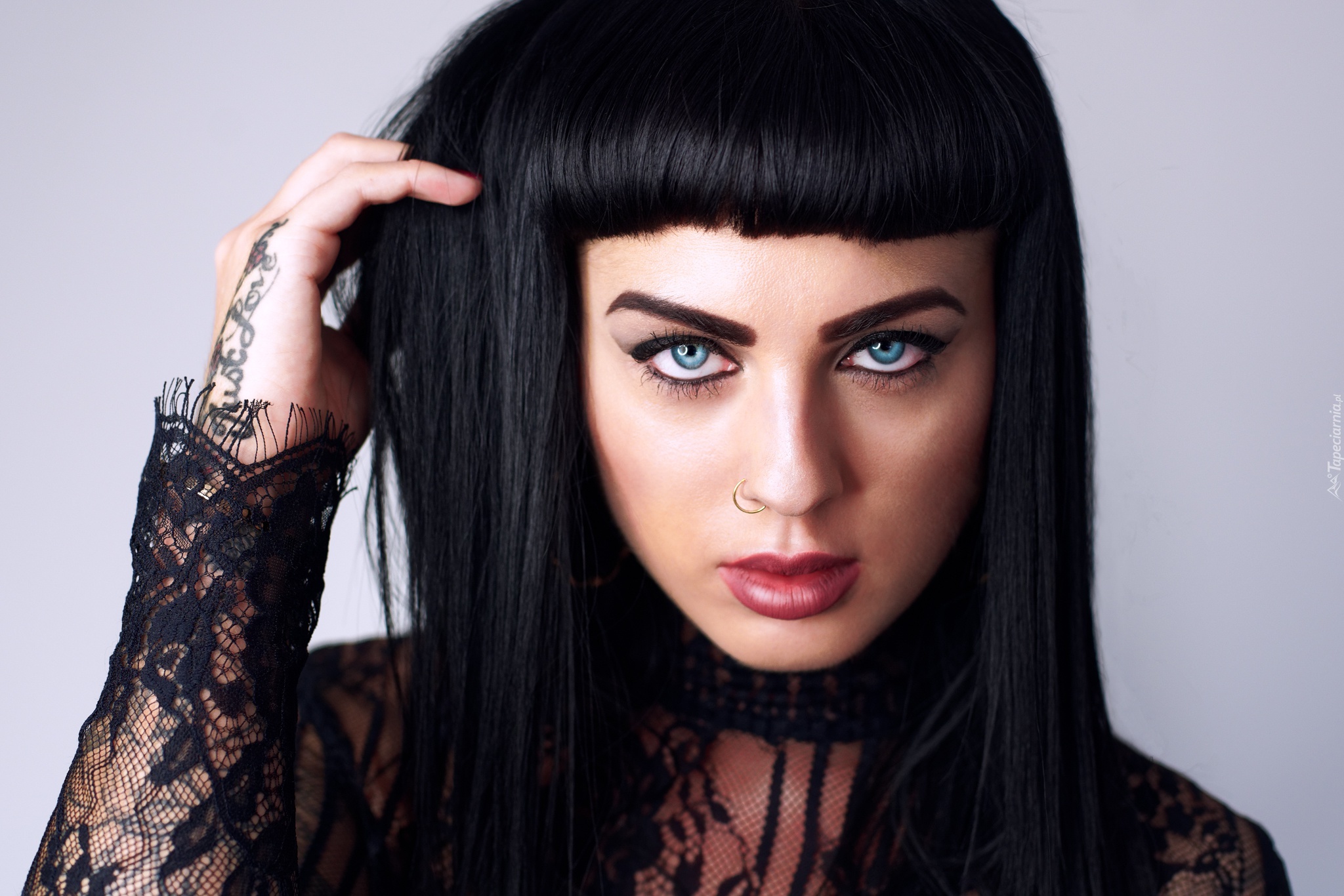 Edytor tapety: Kobieta, Czarne, Włosy, Makijaż, Koronkowa, Bluzka