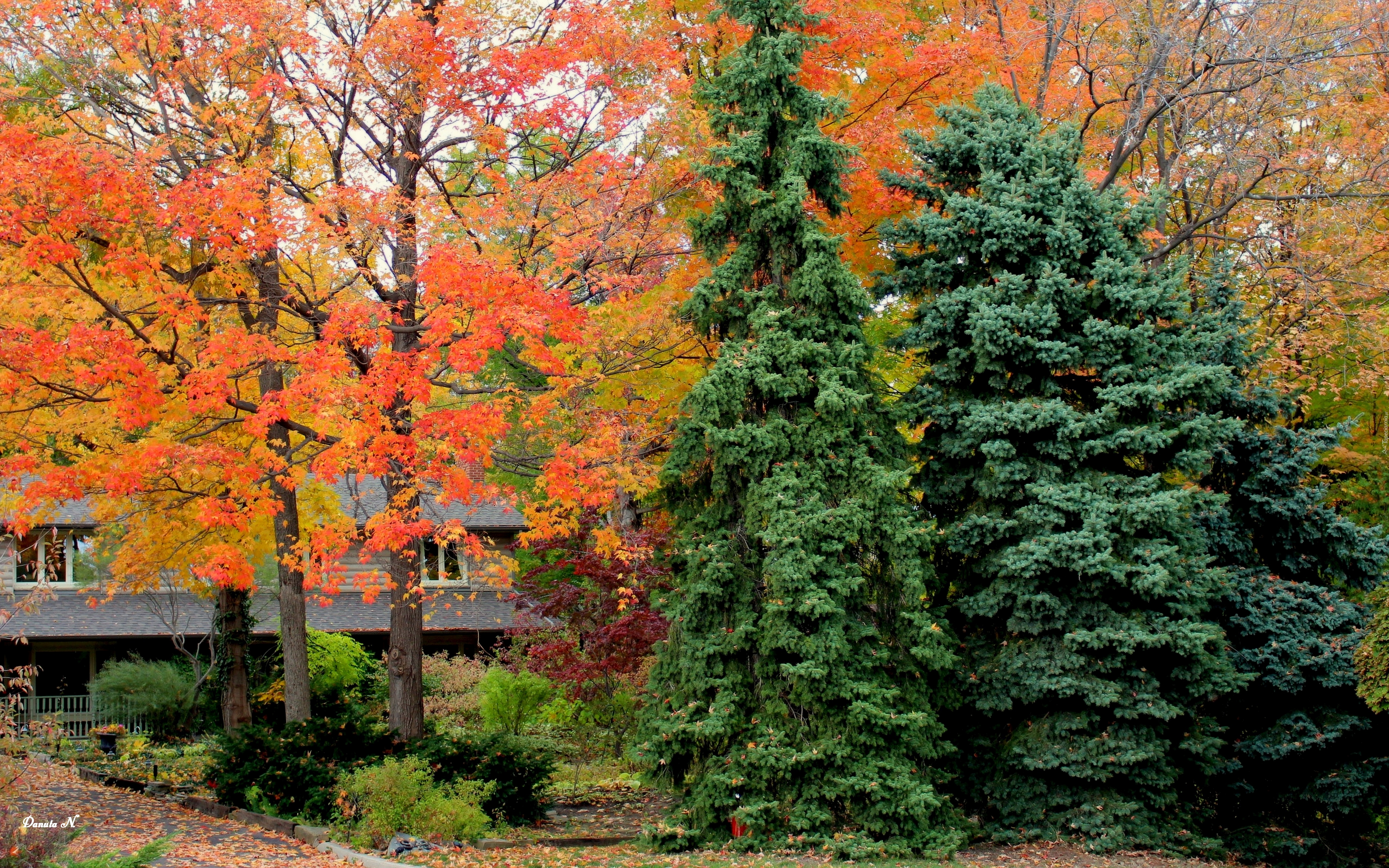 Edytor tapety: Jesienne, Drzewa, Dom, Droga, Liście