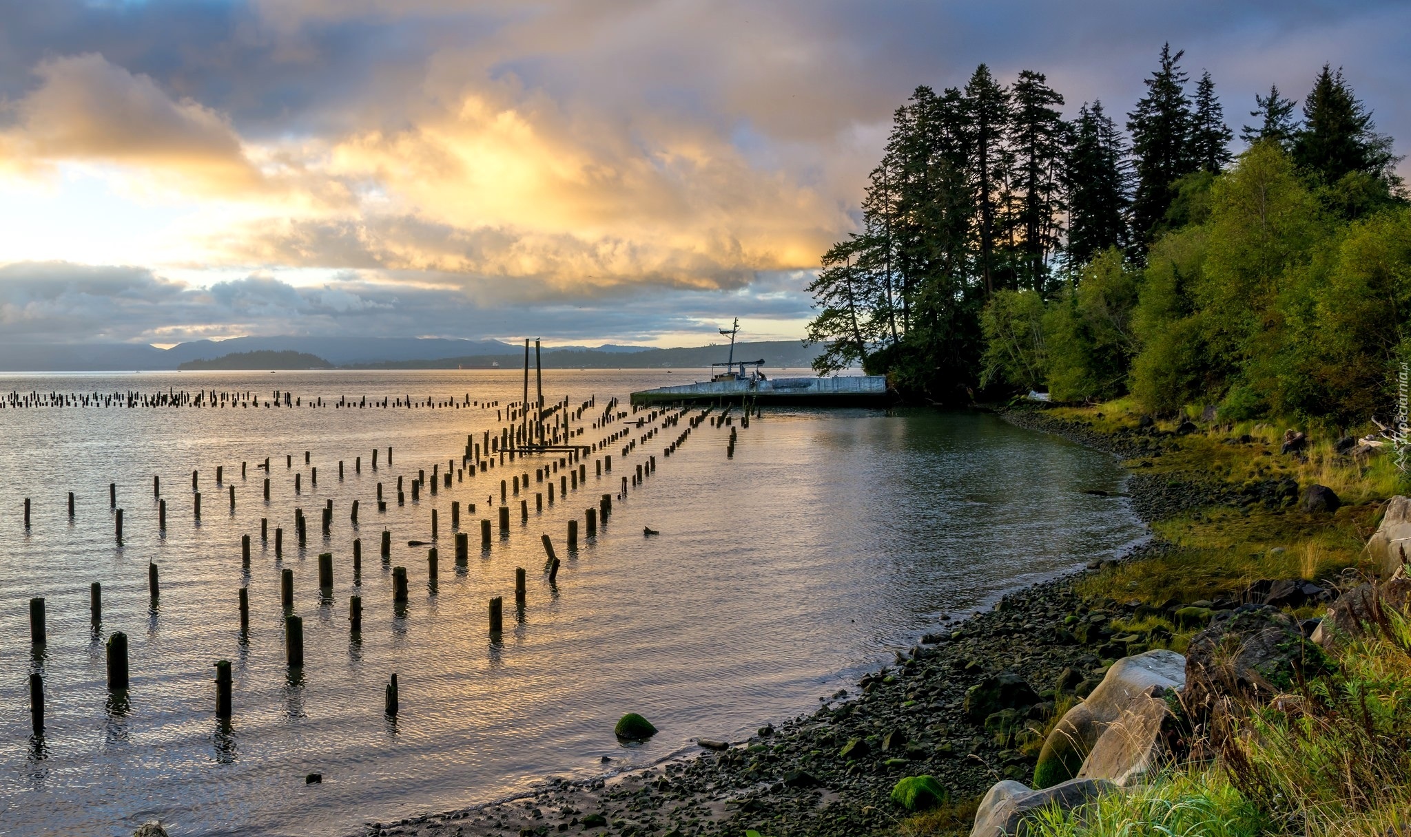 Edytor tapety: Jezioro, Pale, Brzeg, Kamienie, Drzewa, Wschód, Słońca