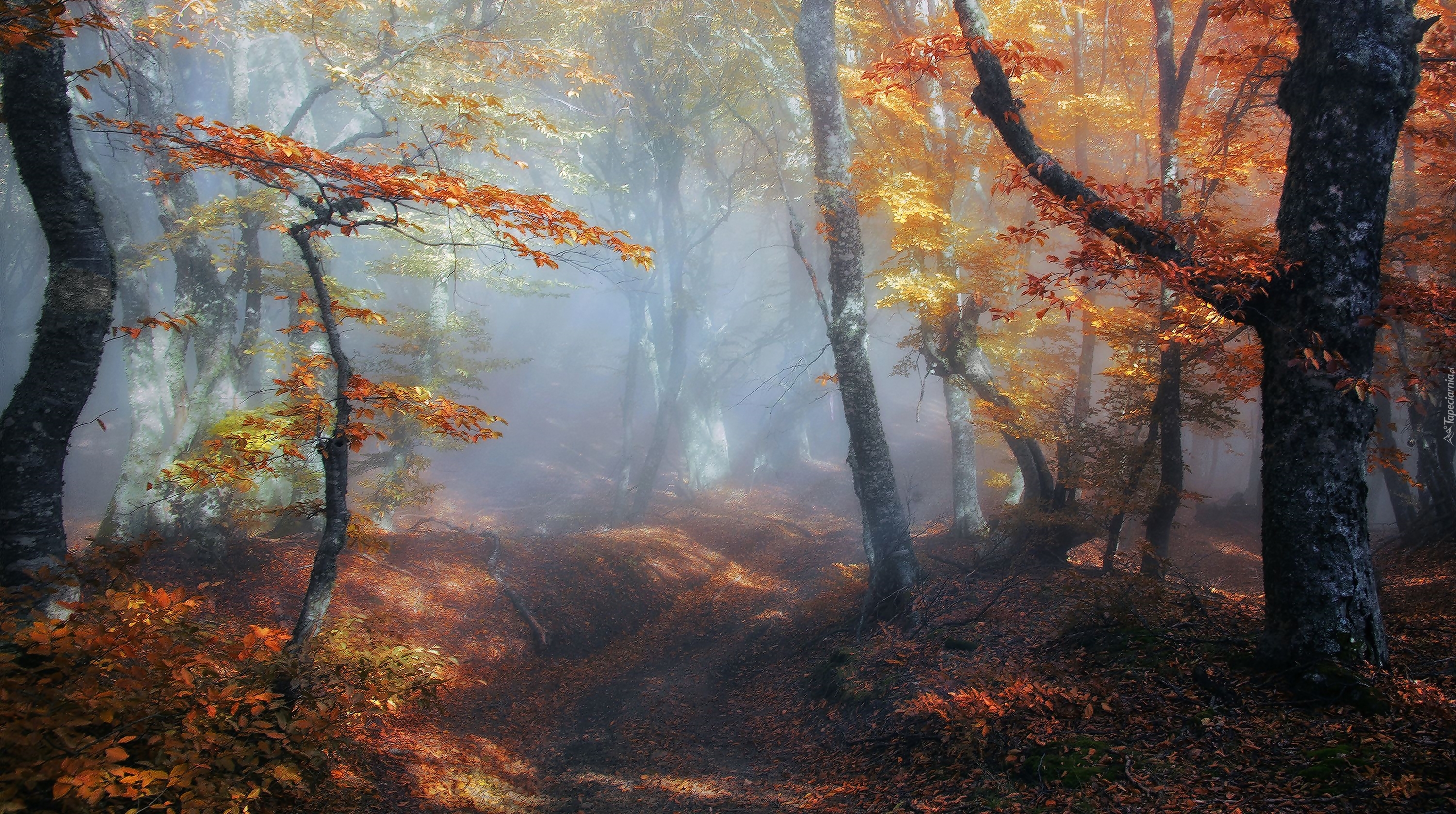 Edytor tapety: Las, Droga, Liście, Drzewa, Mgła, Świt, Jesień