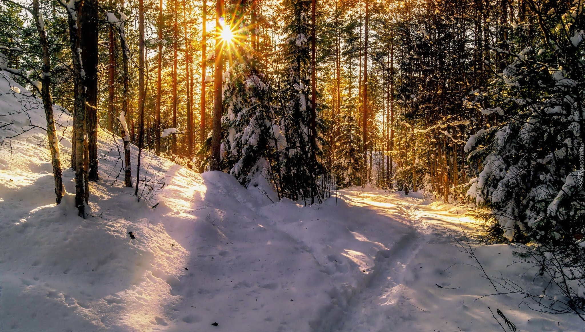 Edytor tapety: Zima, Las, Ścieżka, Wschód, Promienie słońca
