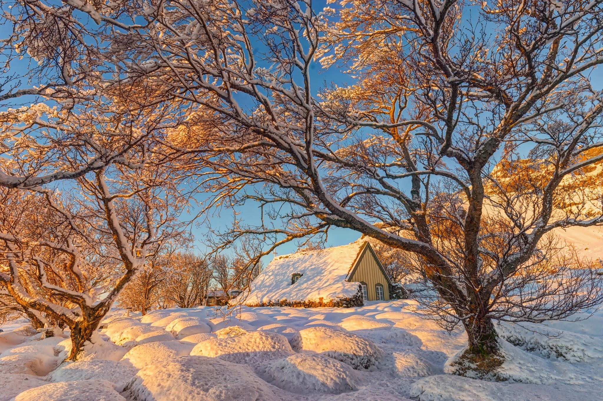 Edytor tapety: Zima, Drzewa, Dom, Przebijające światło