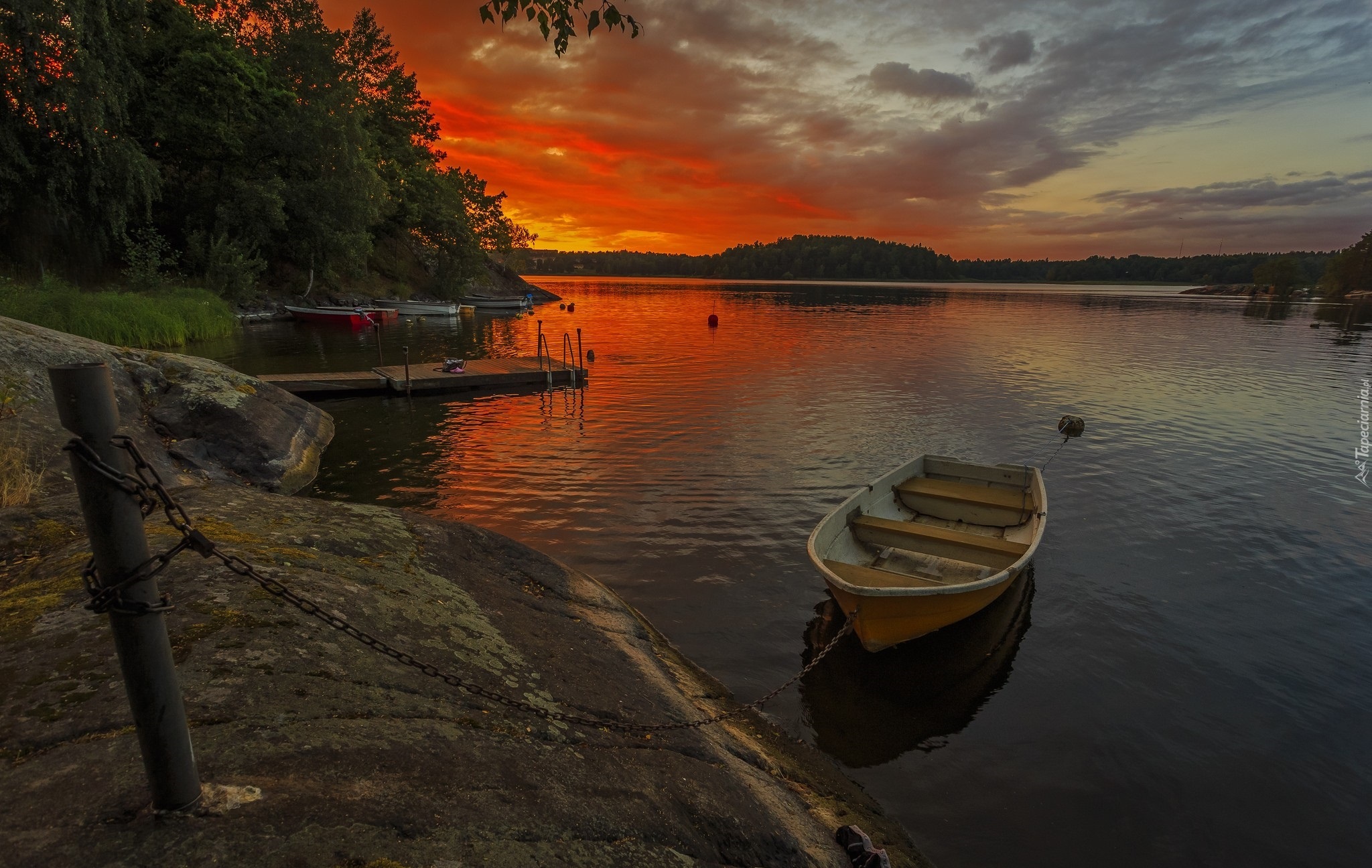 Edytor tapety: Jezioro, Drzewa, Łódki, Kamienie, Pomost, Zachód, Słońca