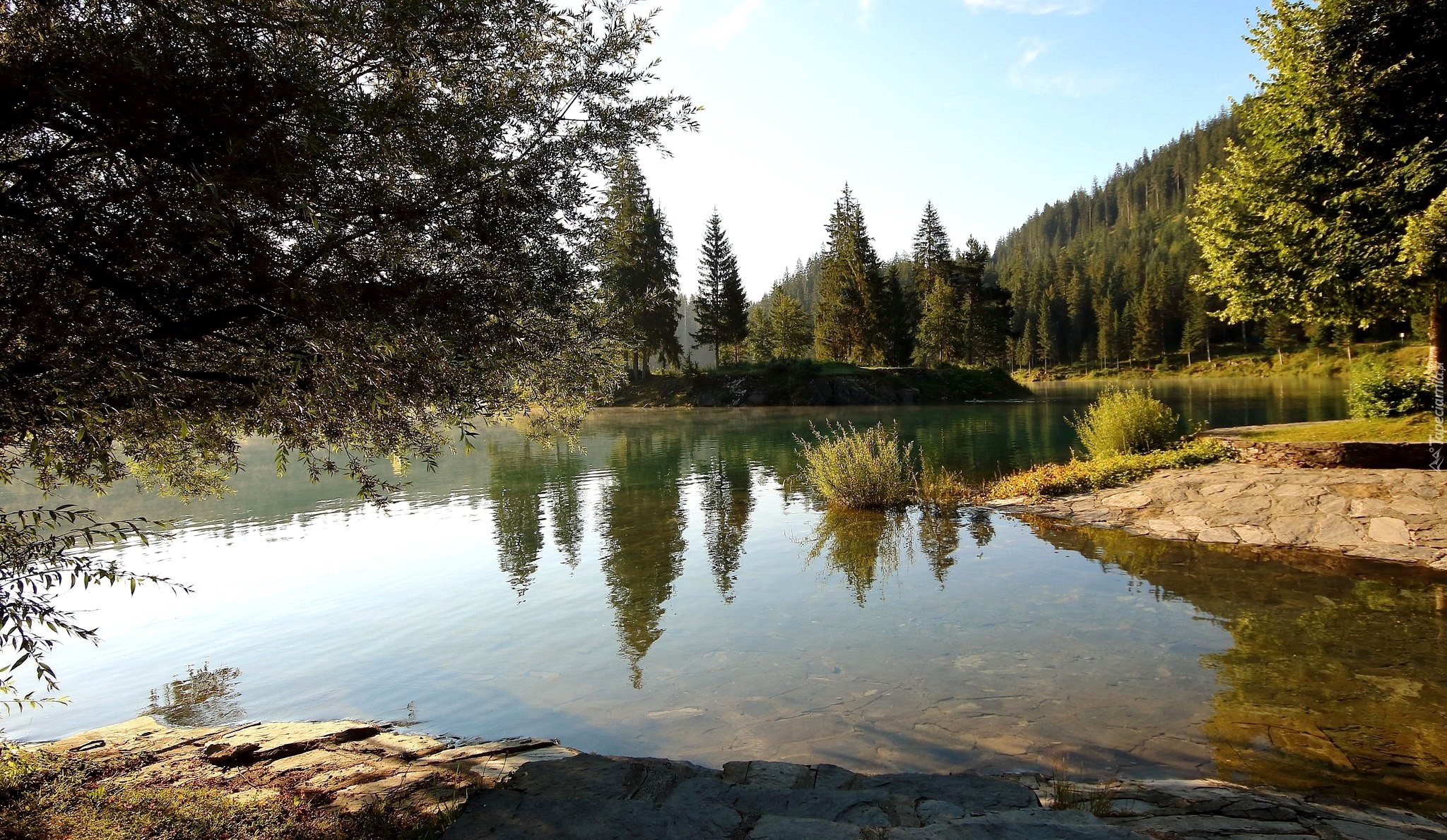 Edytor tapety: Rzeka, Las, Drzewa, Kamienie, Odbicie