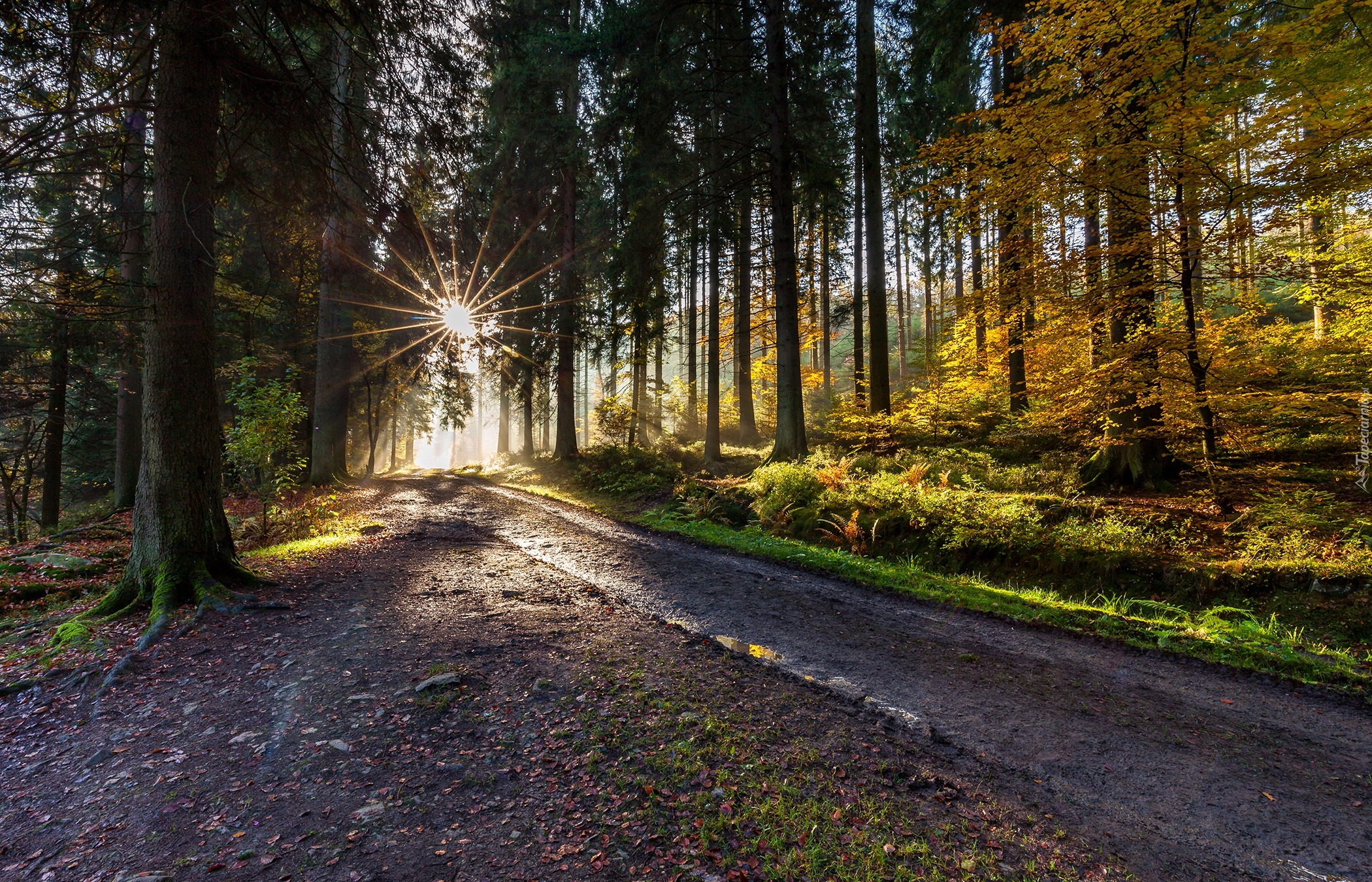 Edytor tapety: Jesień, Droga, Las, Promienie, Wschód słońca