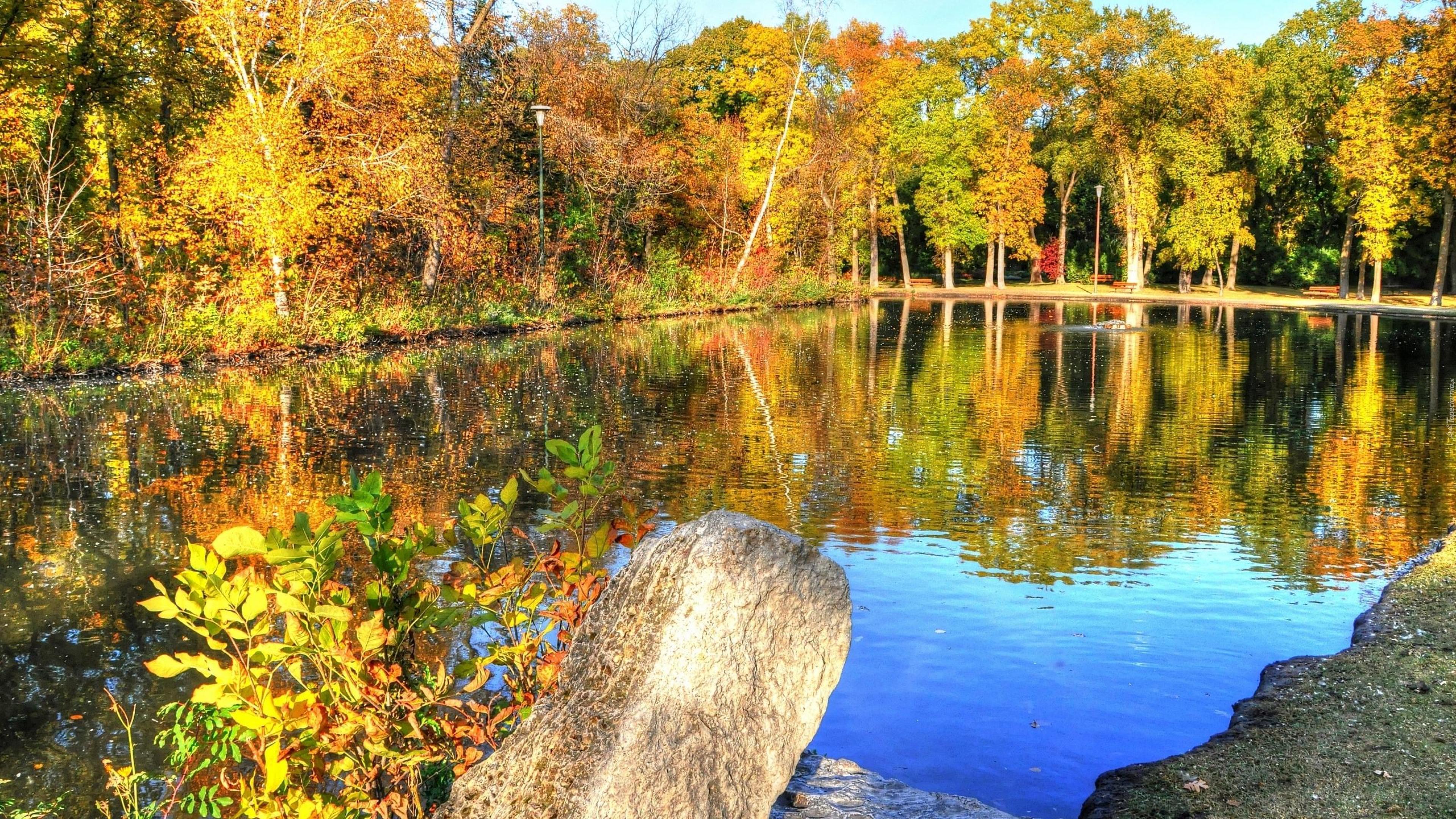 Edytor tapety: Staw, Las, Jesień, Ławki