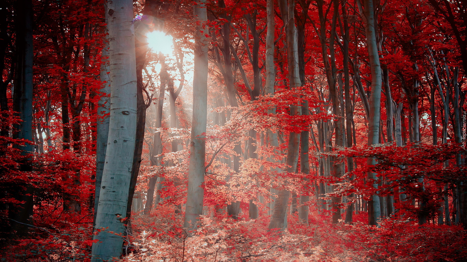 Edytor tapety: Las, Drzewa, Czerwone, Liście, Promienie, Słońca