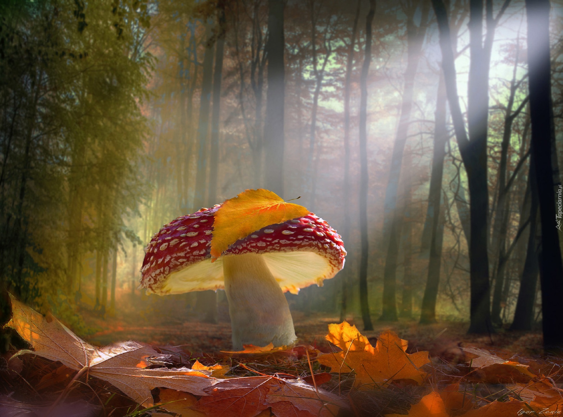 Edytor tapety: Przebijające, Światło, Las, Drzewa, Liście, Grzyb, Muchomor