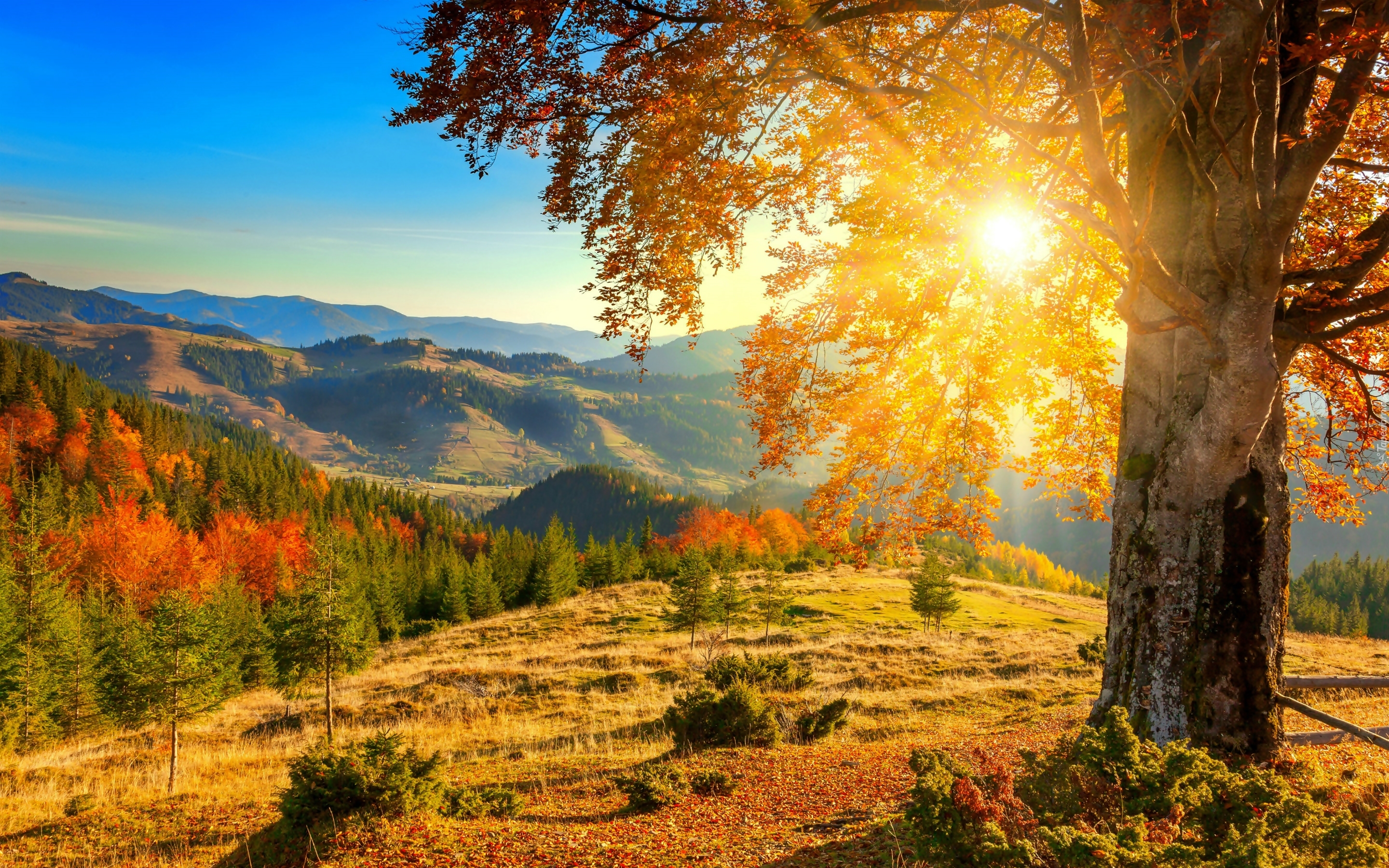 Edytor tapety: Góry, Lasy, Polana, Drzewa, Promienie, Słońca, Świt, Jesień