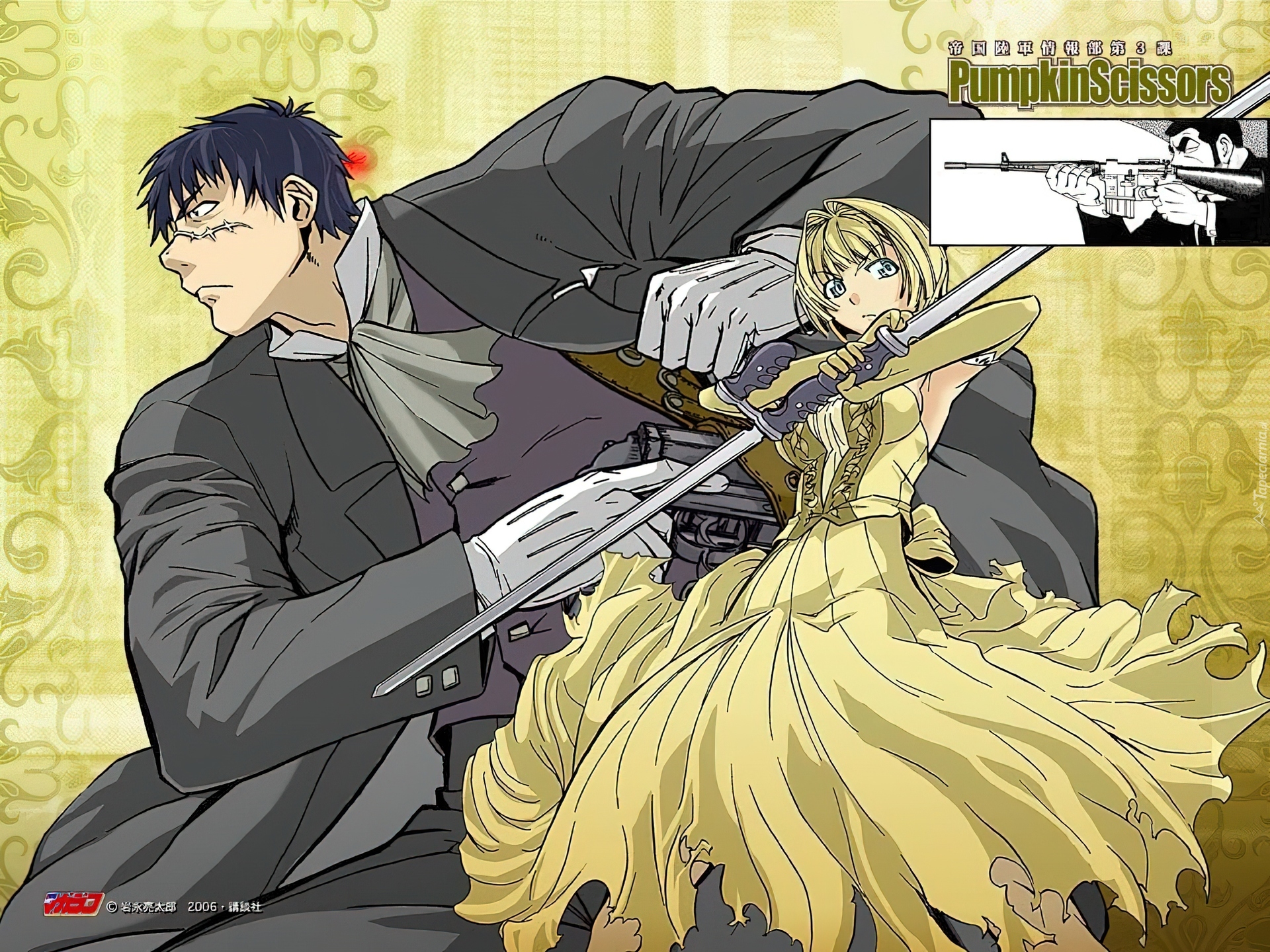 Edytor tapety: Pumpkin Scissors, ludzie, karabin, miecz