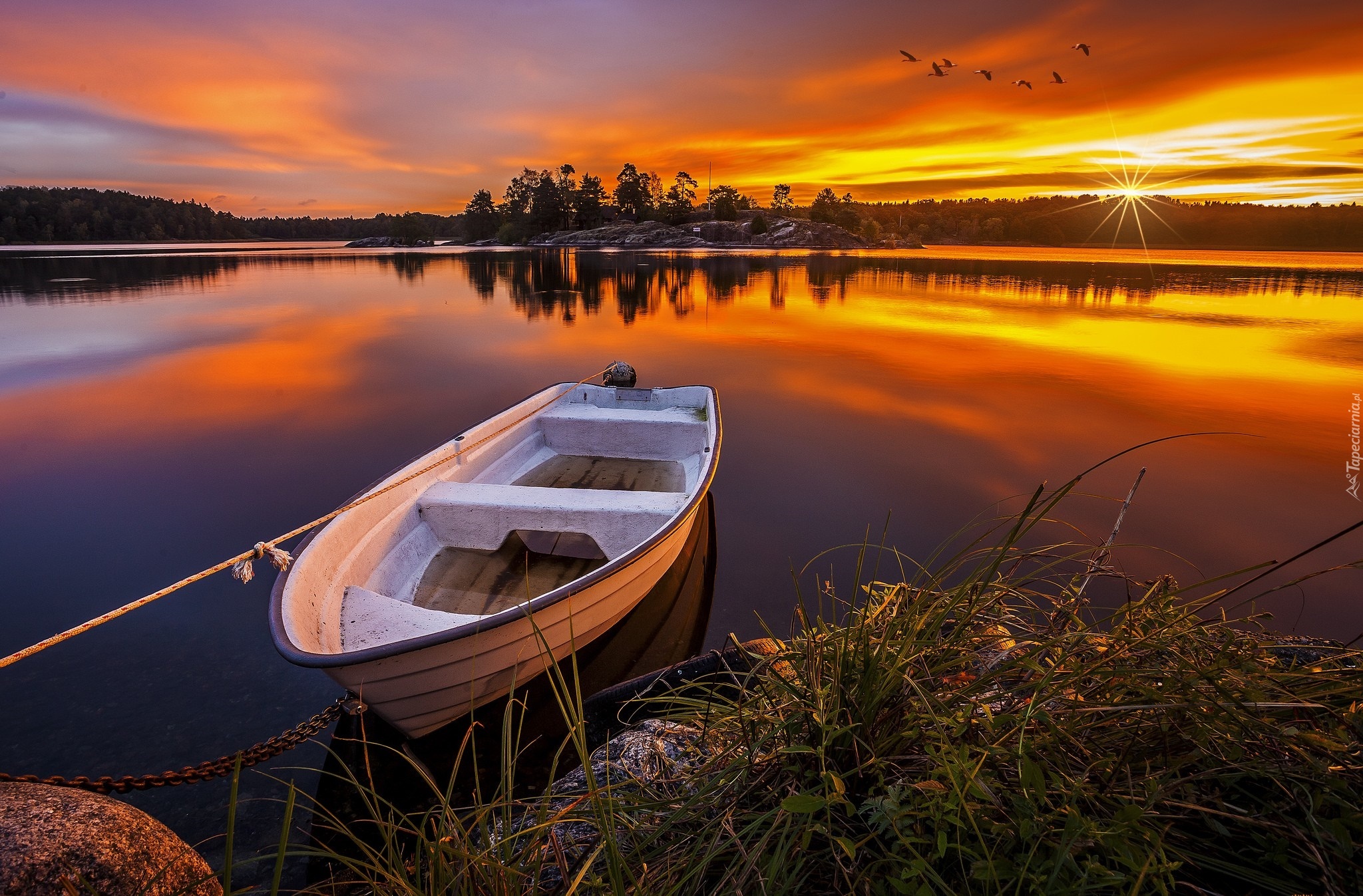 Edytor tapety: Jezioro, Łódka, Zachód, Promienie słońca