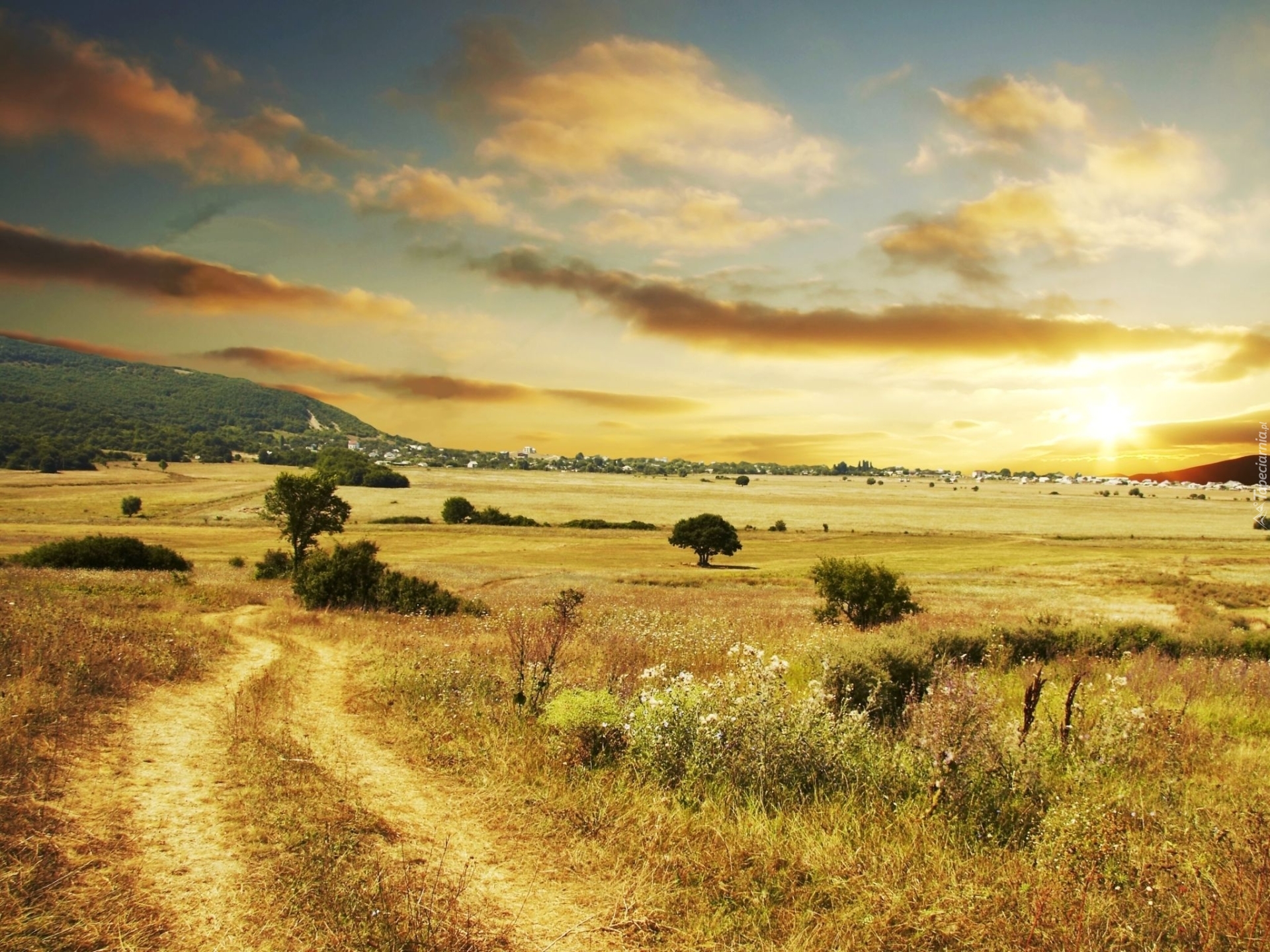 Edytor tapety: Pole, Drzewa, Droga, Trawa, Wzgórza