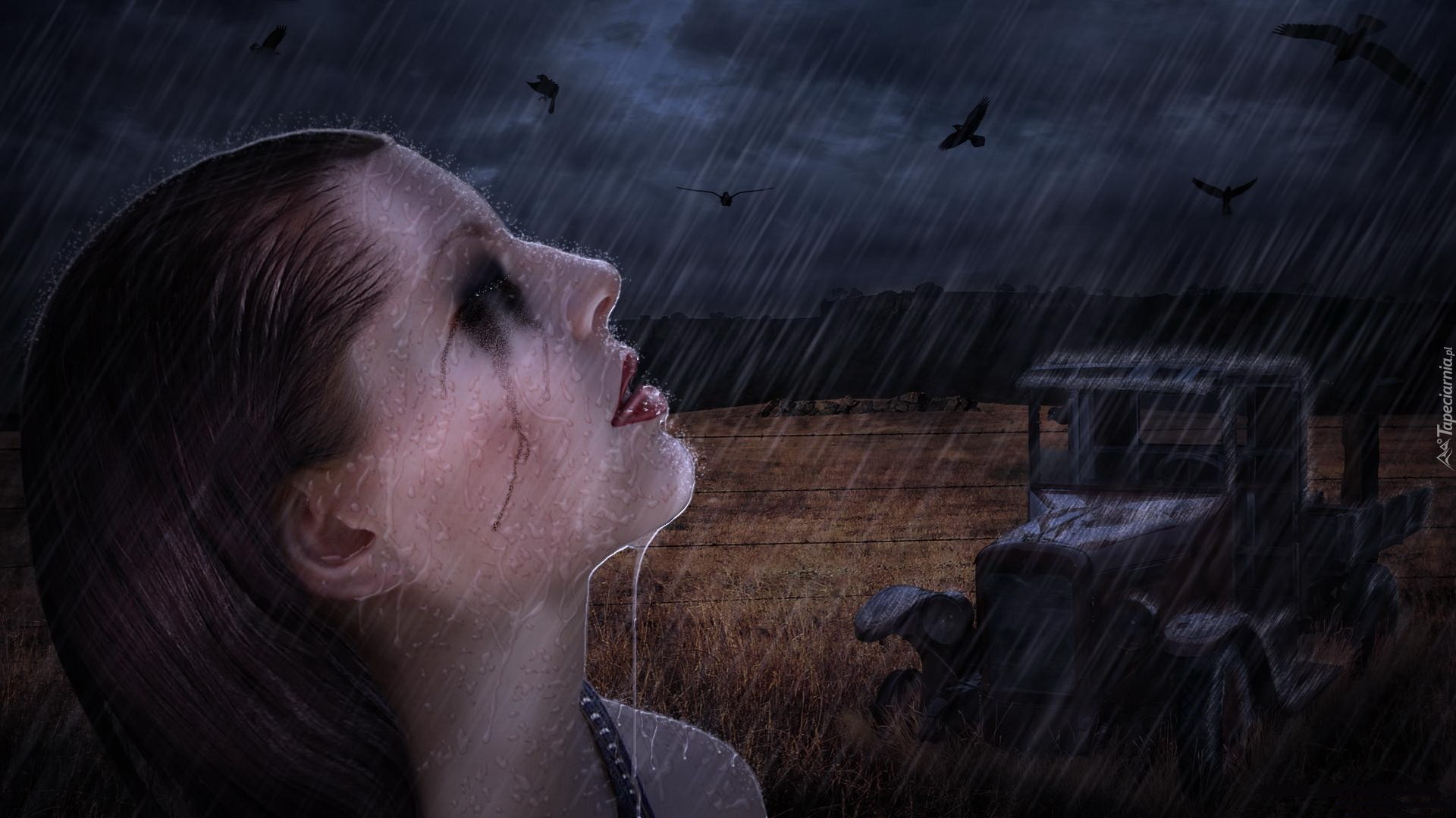 Edytor tapety: Fantasy, Kobieta, Deszcz, Wrak, Samochodu, Ptaki