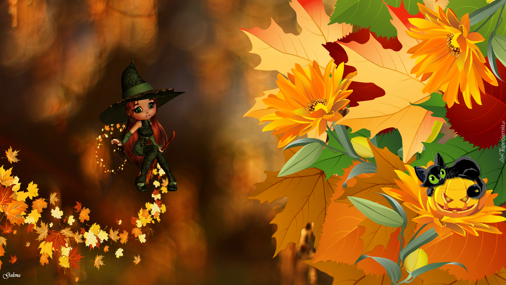 Edytor tapety: Wiedźma, Kot, Liście, Kwiaty, Jesień, Halloween, Grafika