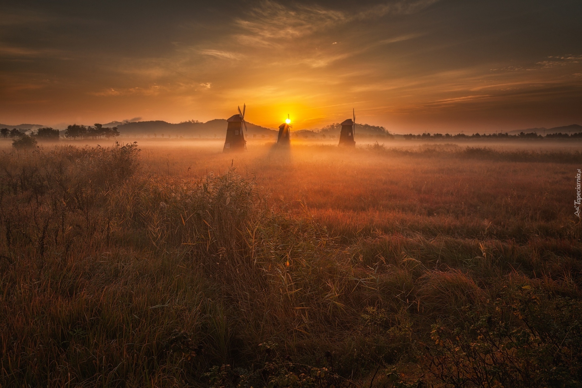 Edytor tapety: Wiatrak, Mgła, Wschód słońca
