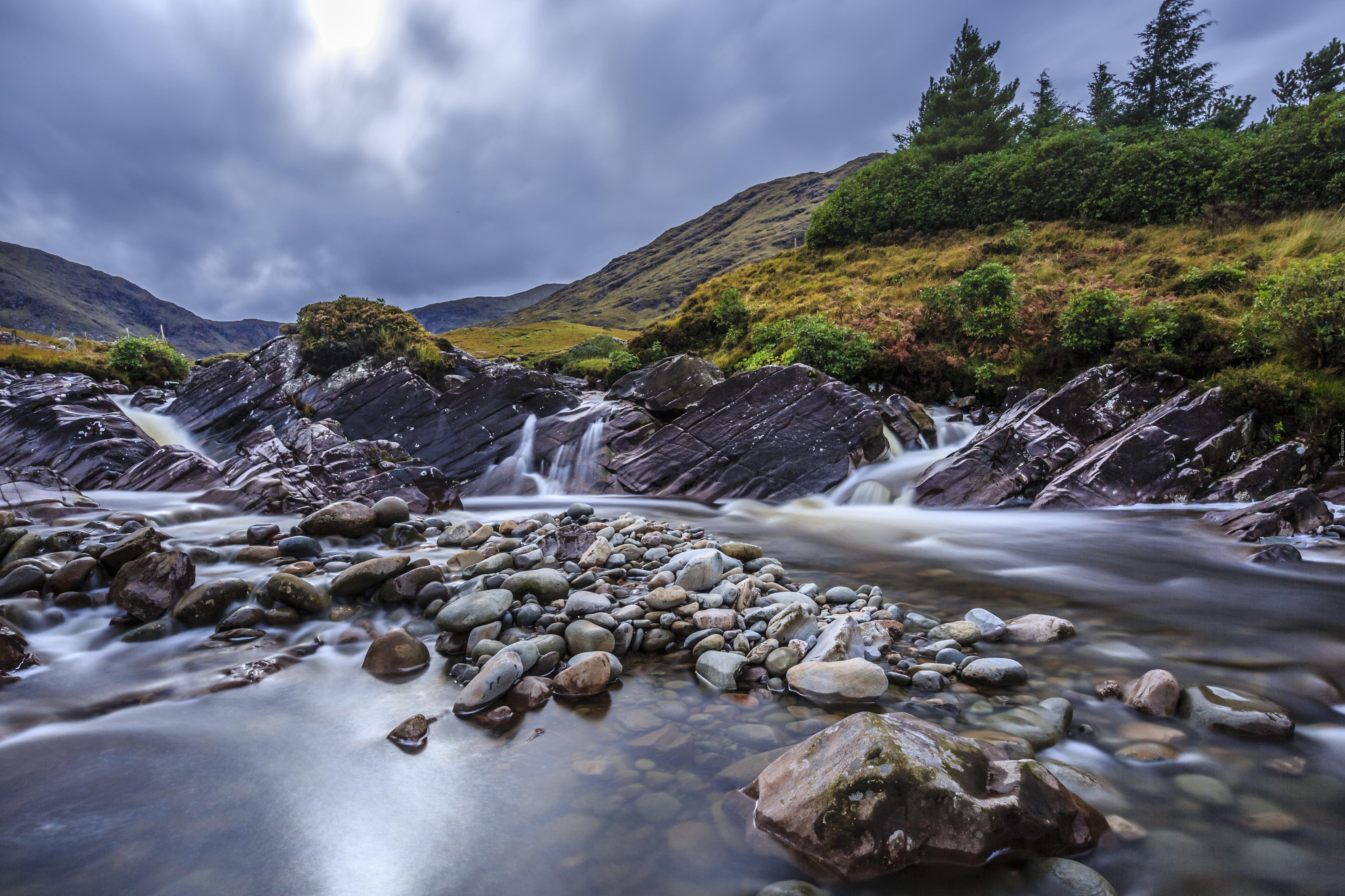 Edytor tapety: Górska, Rzeka, Kamienie, Skały, Drzewa