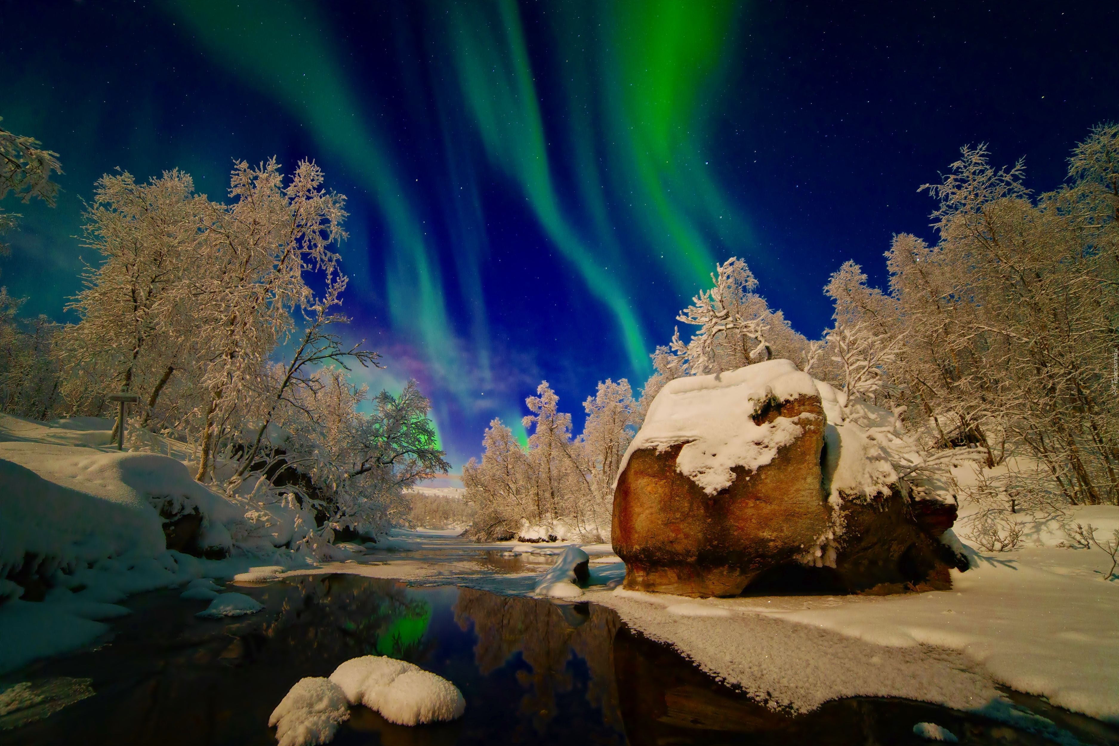 Edytor tapety: Zima, Rzeka, Głaz, Zorza polarna