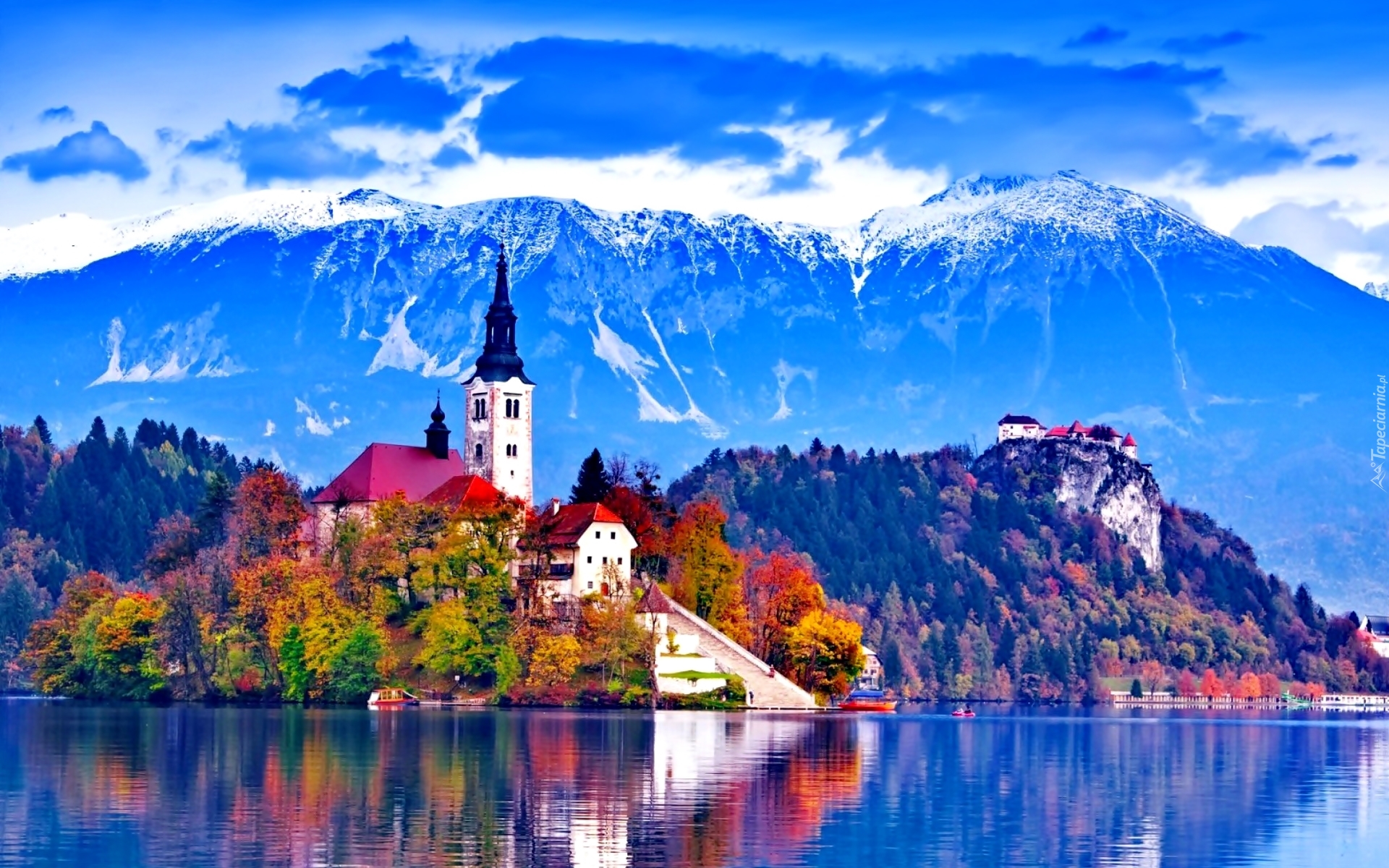 Edytor tapety: Jezioro Bled, Kościół, Góry, Lasy, Jesień, Słowenia