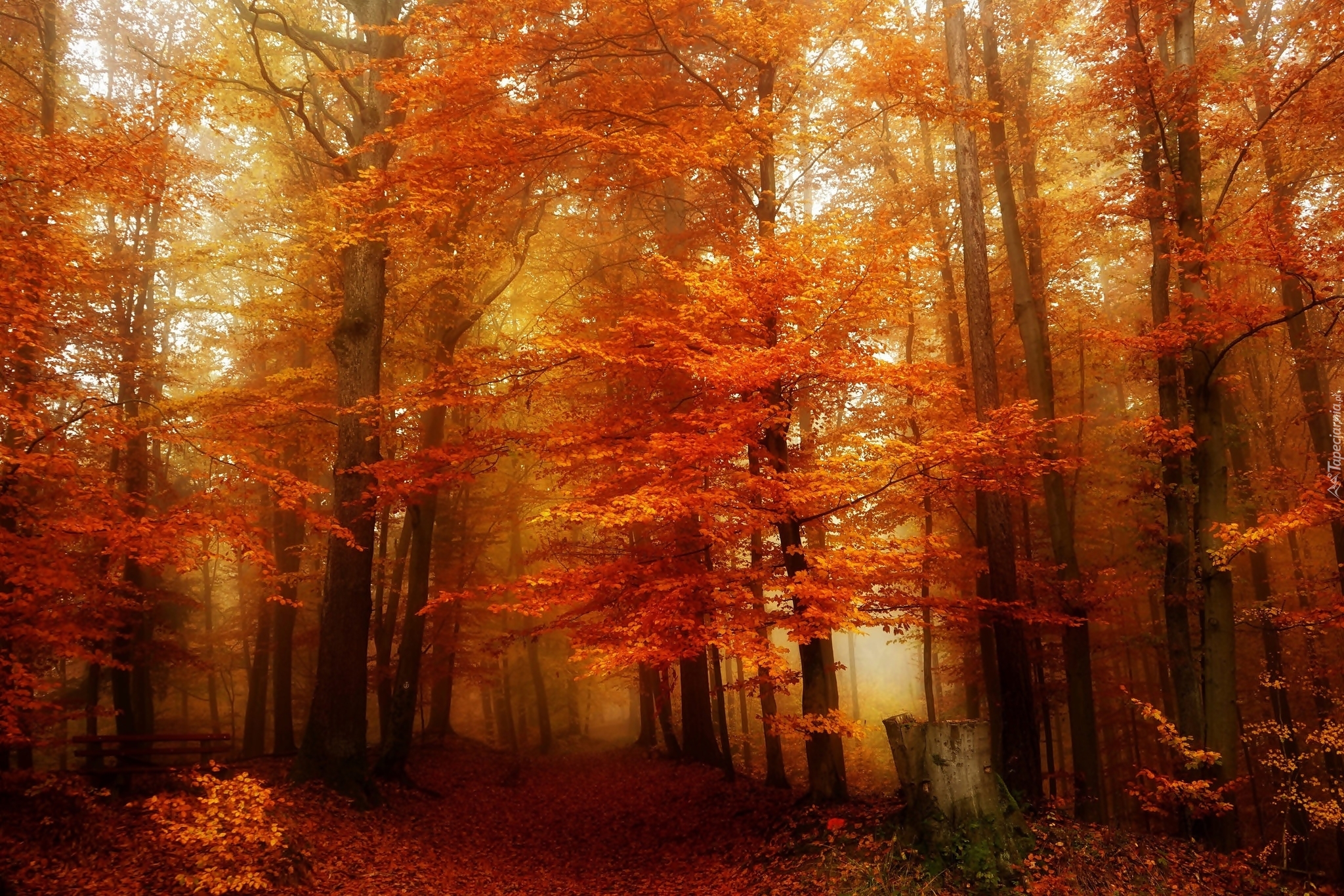 Edytor tapety: Las, Drzewa, Droga, Liście, Mgła, Złota, Jesień