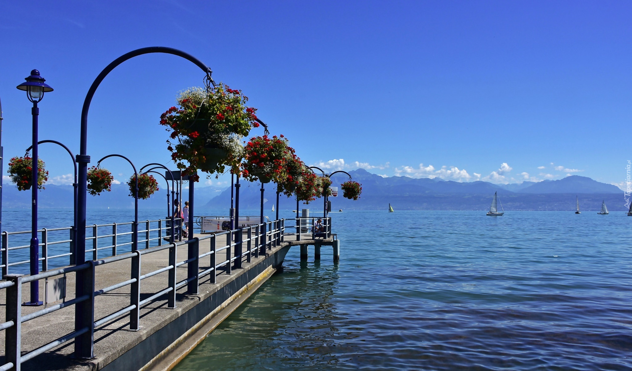 Edytor tapety: Szwajcaria, Jezioro, Pomost, Kwiaty