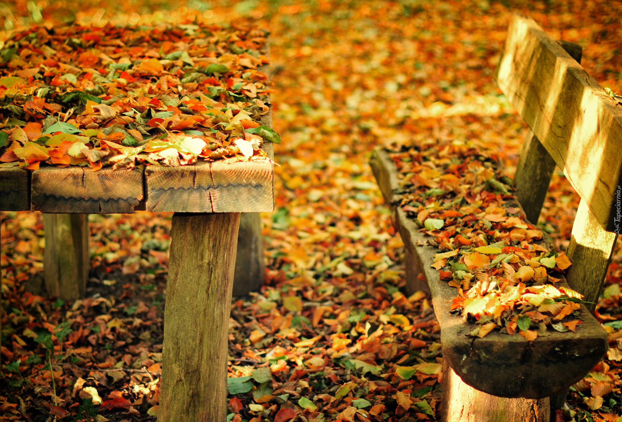 Edytor tapety: Ławeczka osypana jesiennymi liśćmi