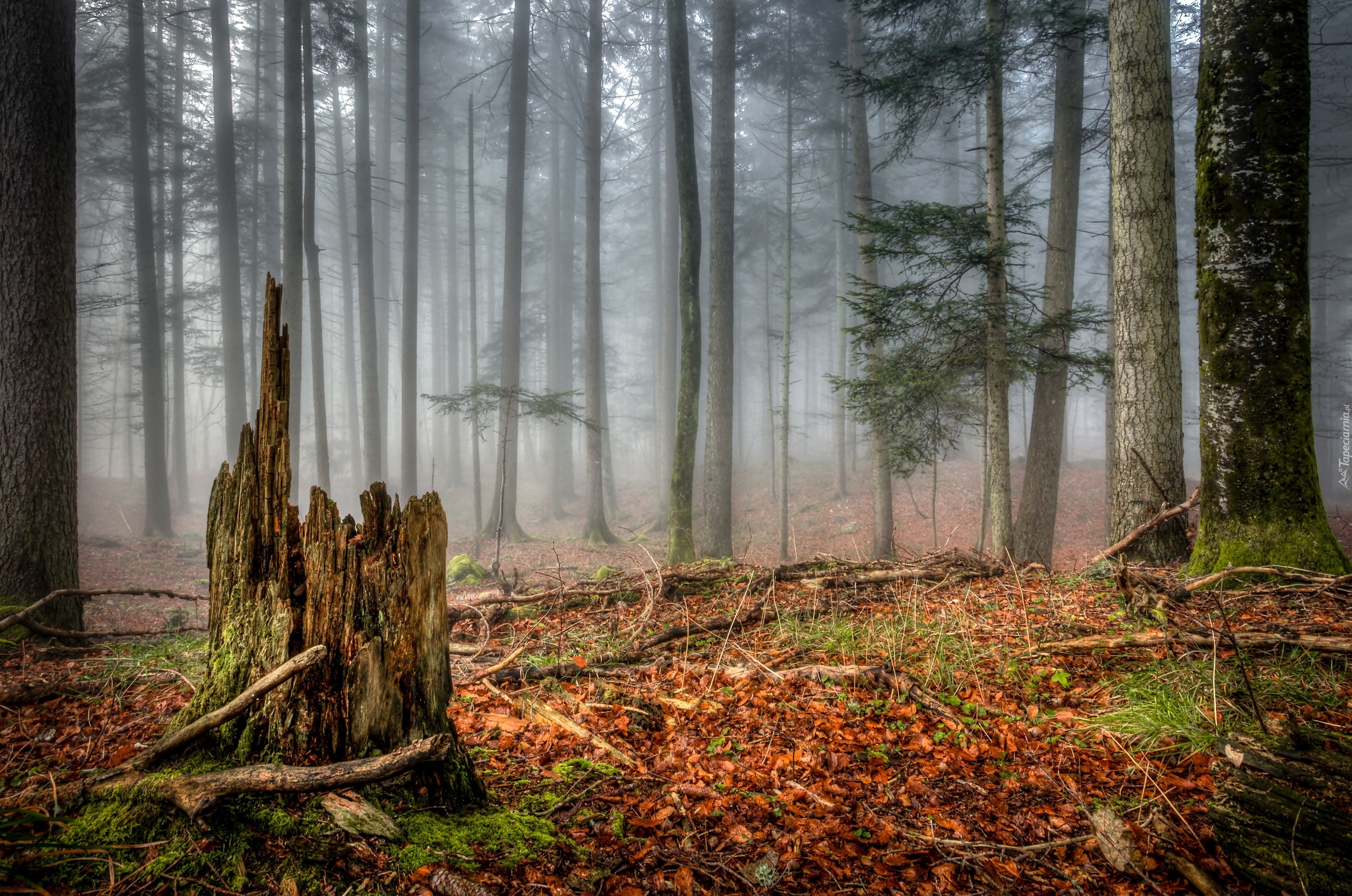Edytor tapety: Stary pień w zamglonym lesie