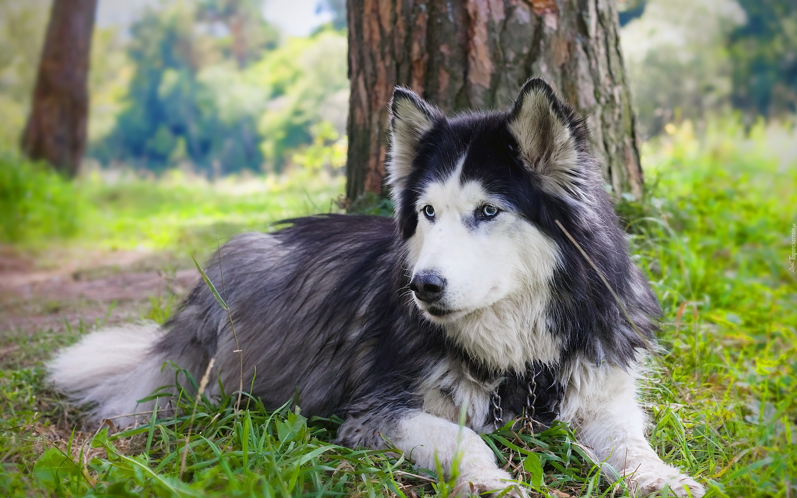Edytor tapety: Kudłaty czarno-biały pies odpoczywający pod drzewem