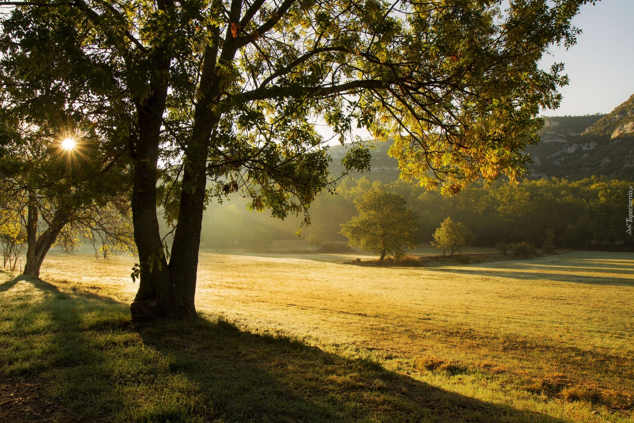Edytor tapety: Jesienny poranek na zamglonej łące pełnej drzew