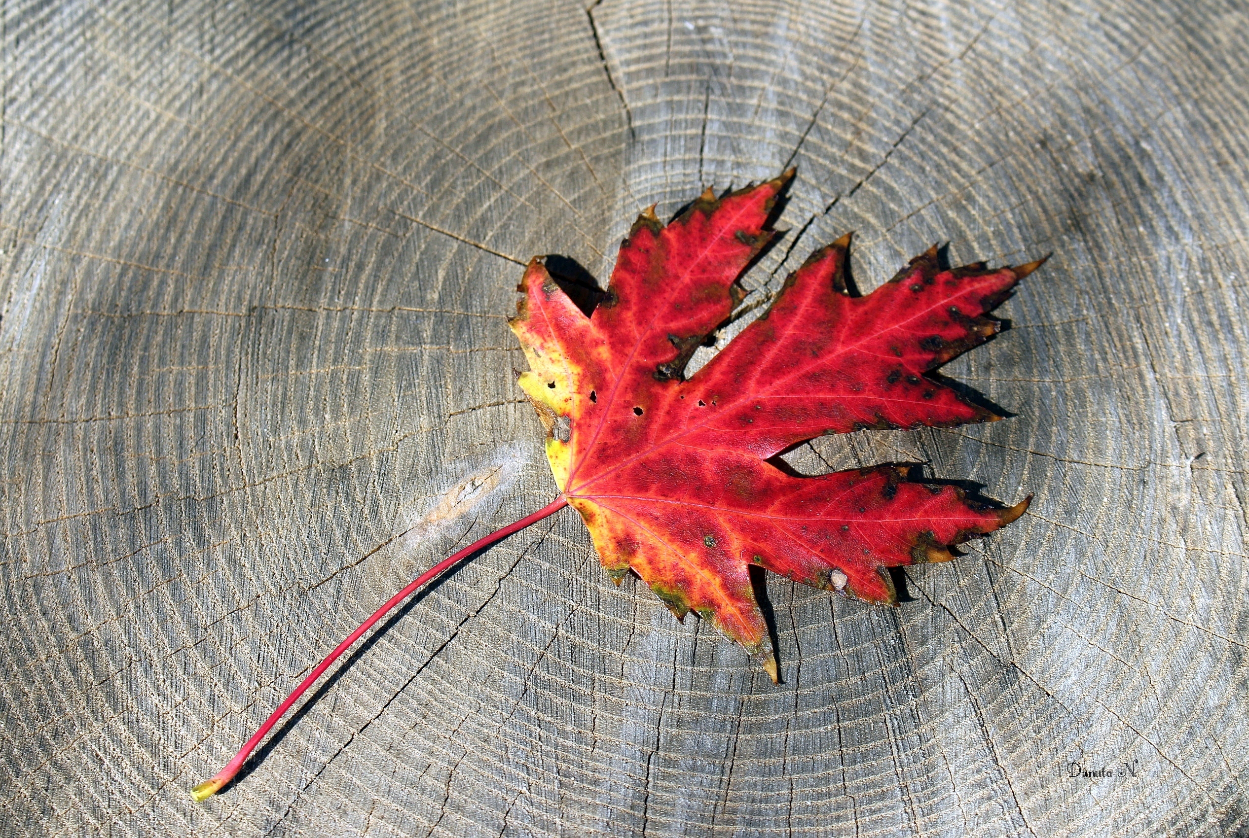 Edytor tapety: Czerwony liść klonu na pniu drzewa