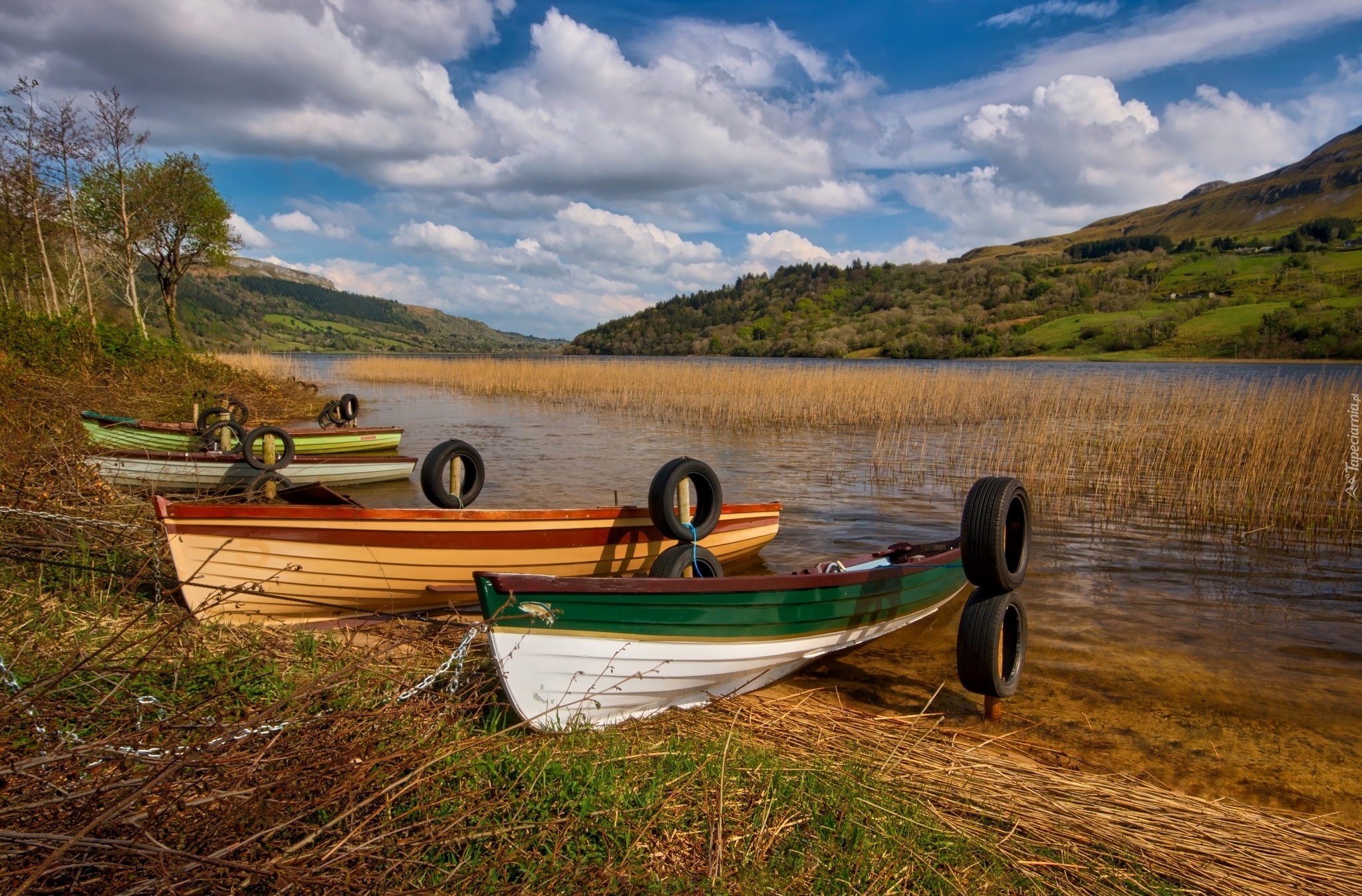 Edytor tapety: Łódki nad brzegiem jeziora