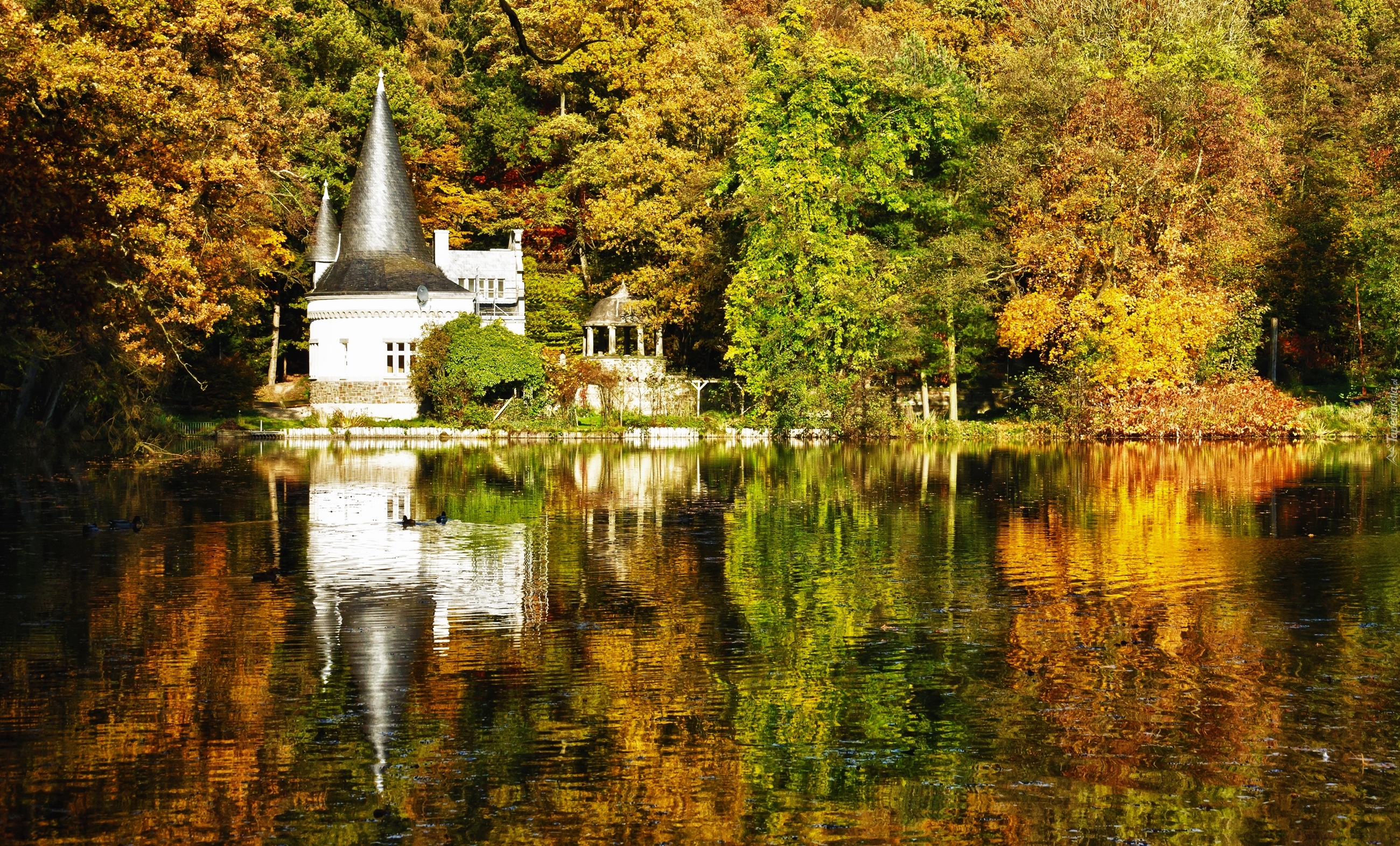 Edytor tapety: Biały budynek w lesie nad jeziorem