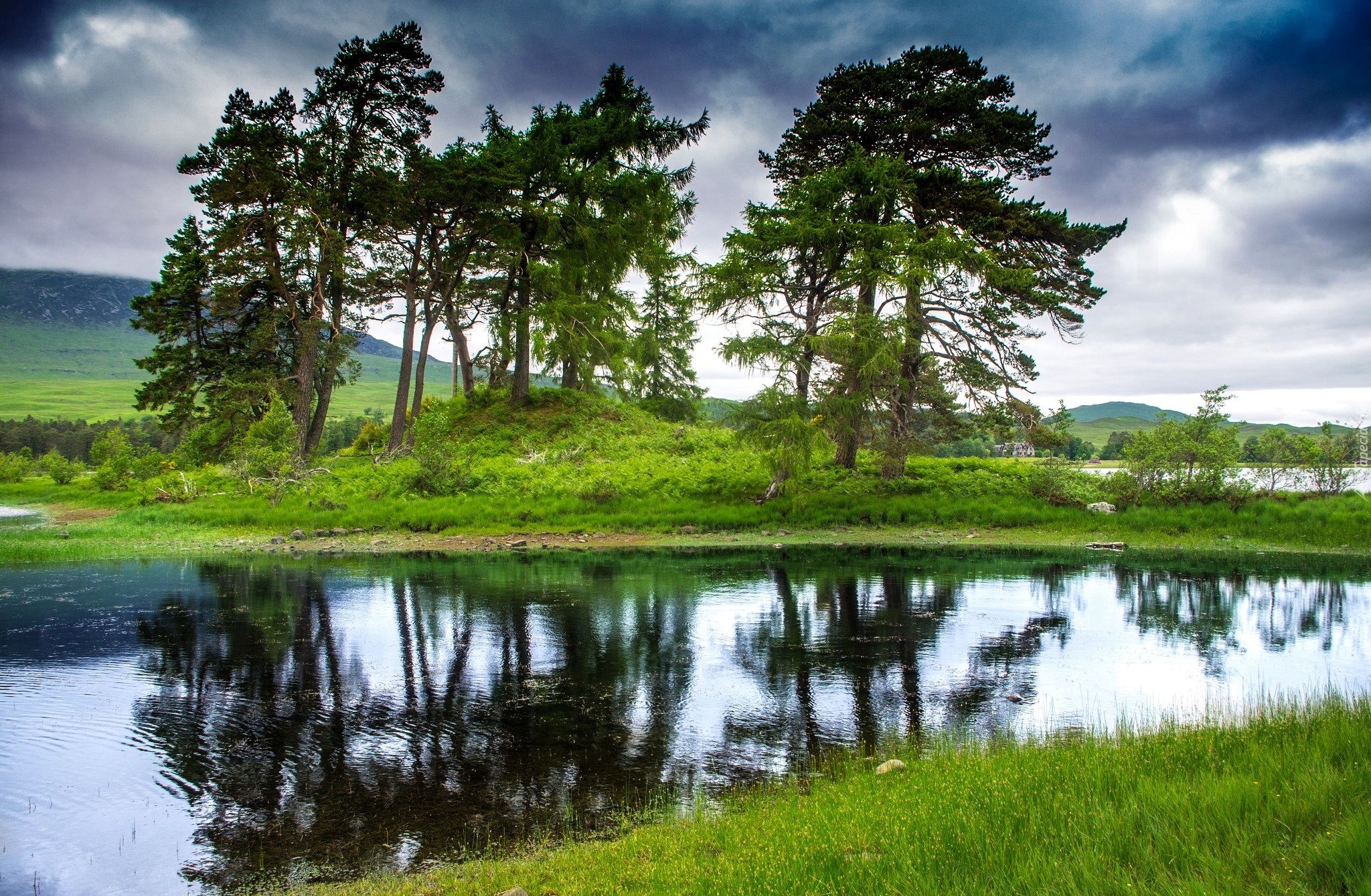 Edytor tapety: Rzeka lustrem dla rosnących drzew na łące