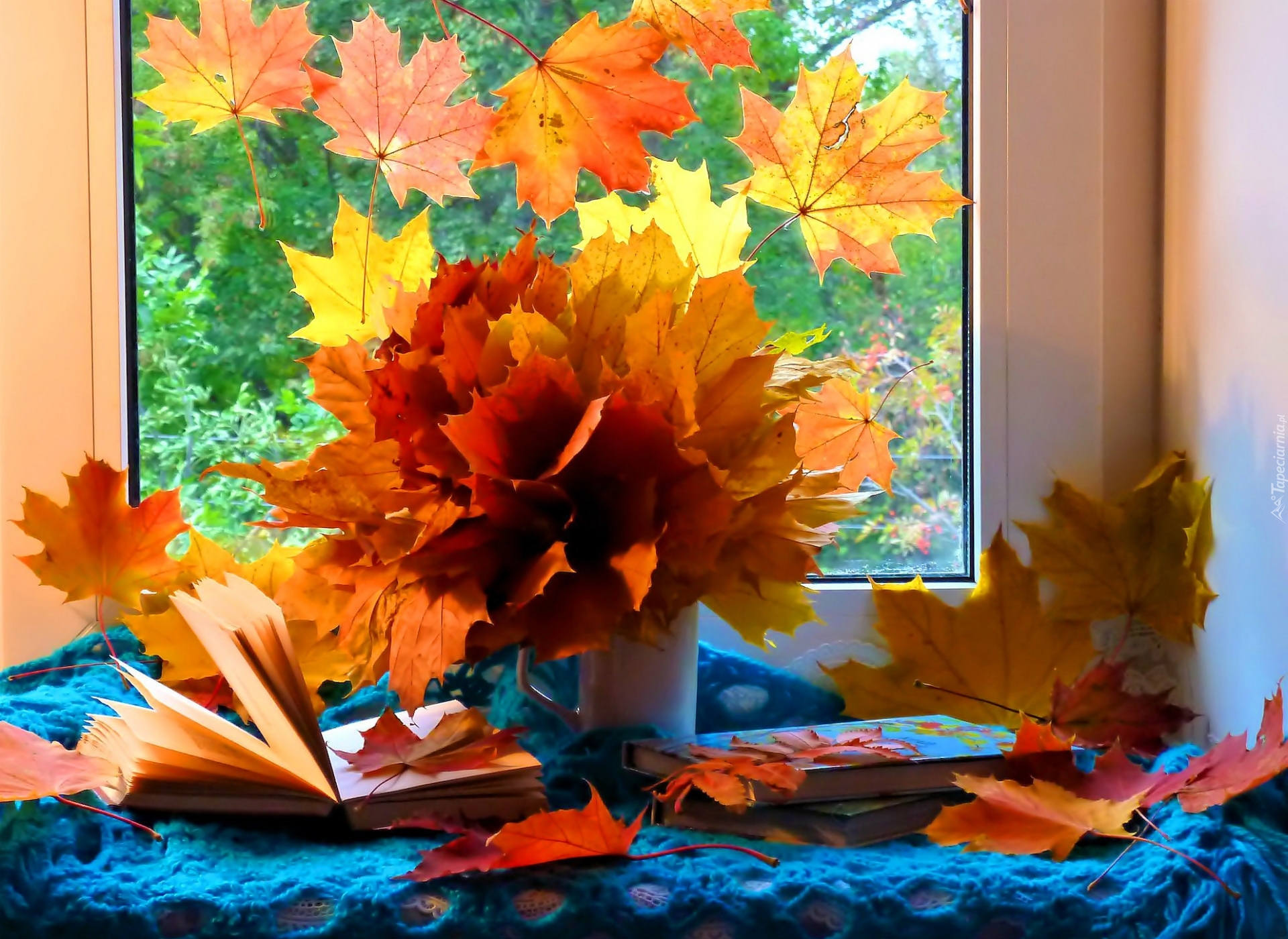 Edytor tapety: Kompozycja z jesiennych liści na oknie
