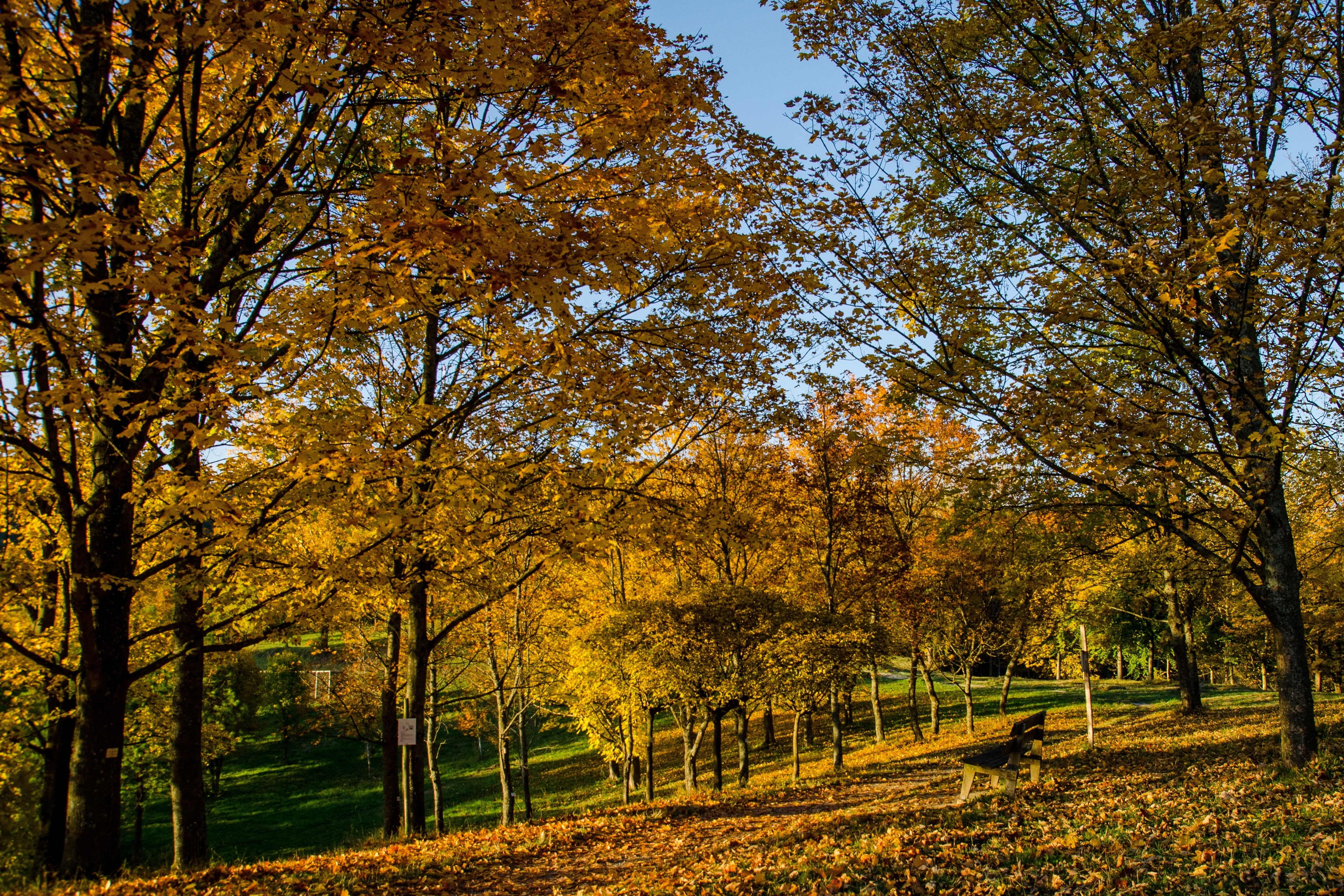 Edytor tapety: Ławka w parku i kolorowe jesienne drzewa