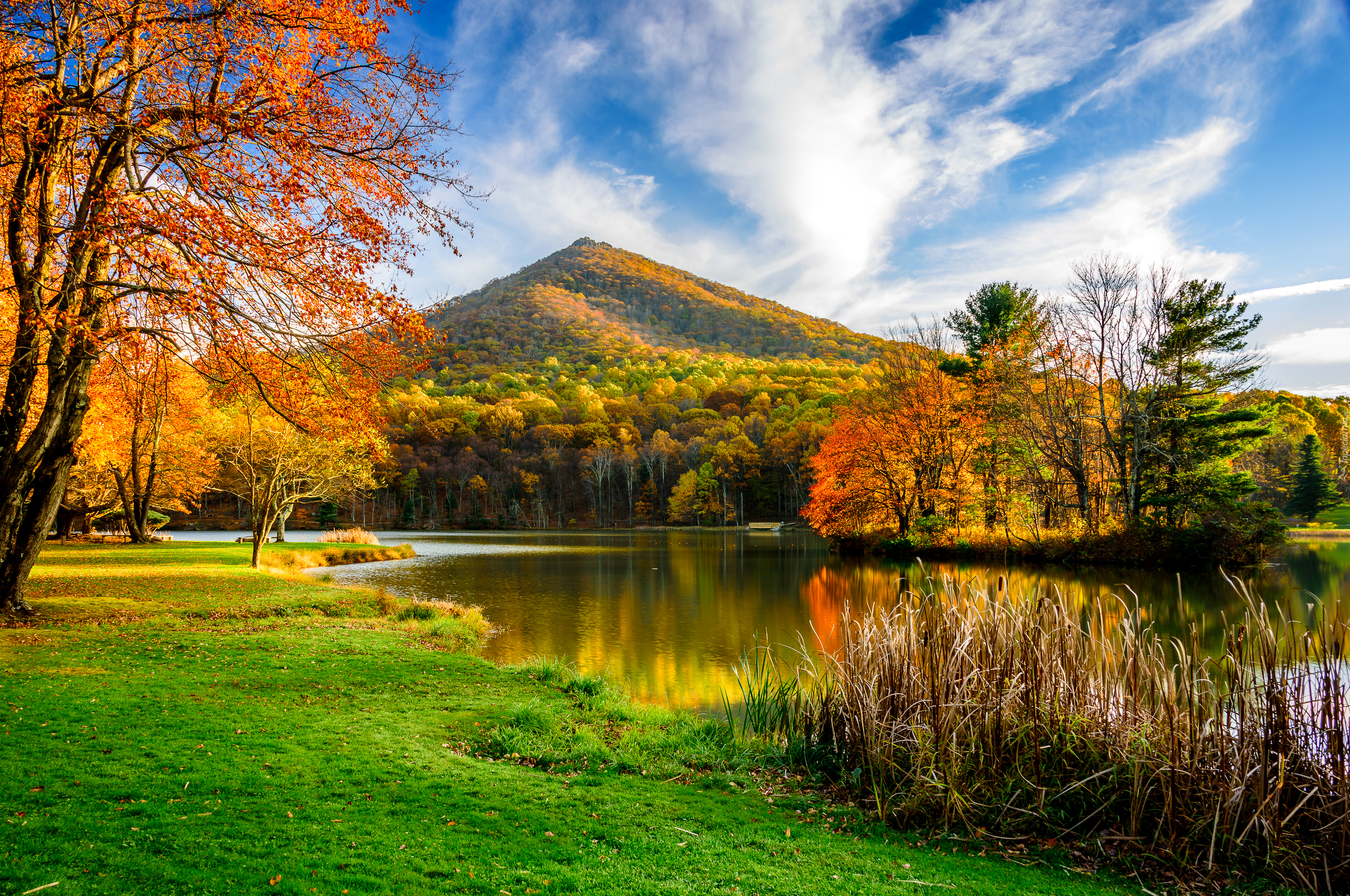 Edytor tapety: Jesienna roślinność nad rzeczką u podnóża gór