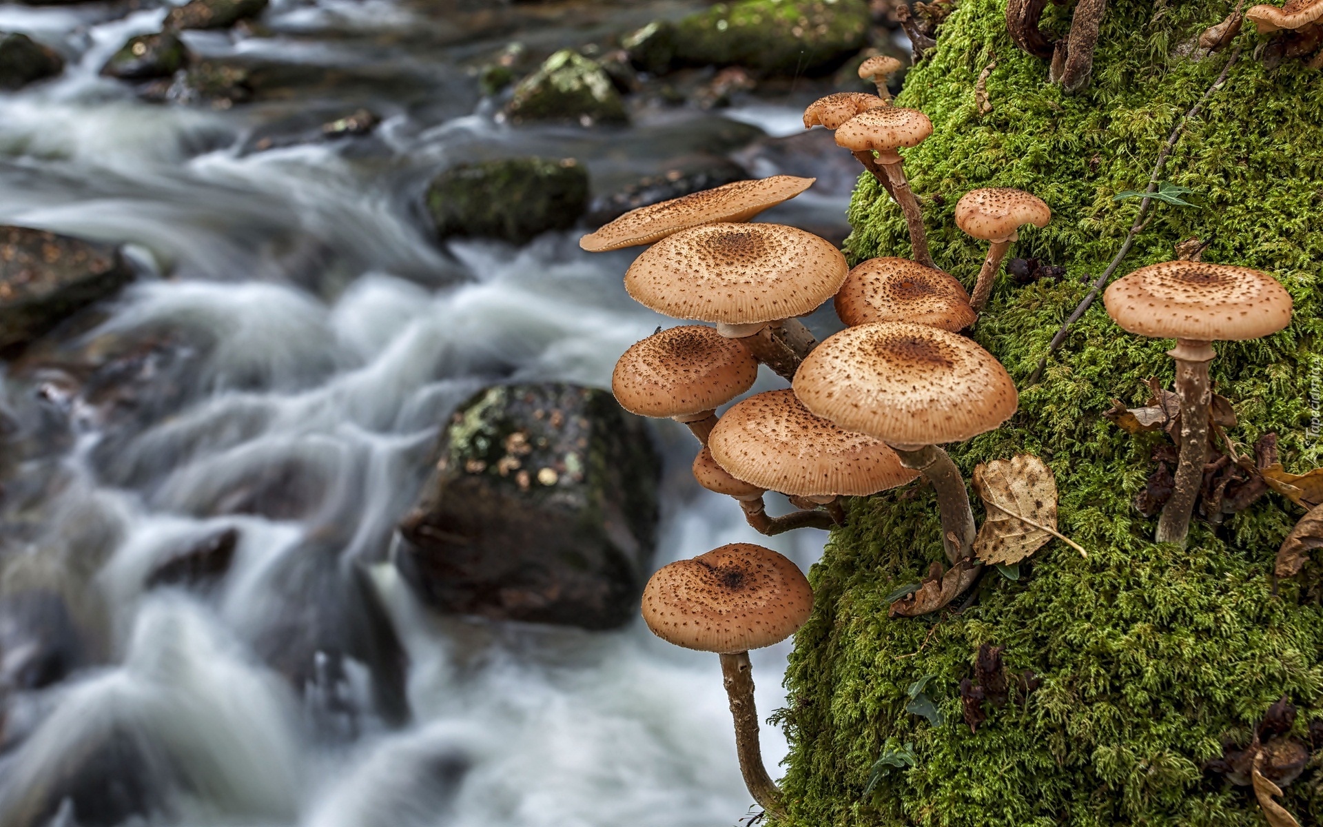 Edytor tapety: Opieńki na mchu przy wodospadzie